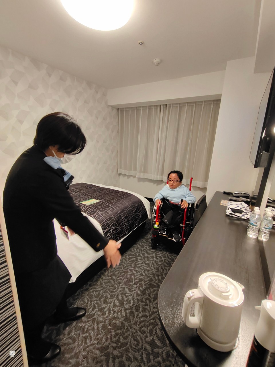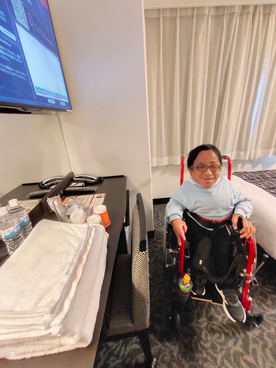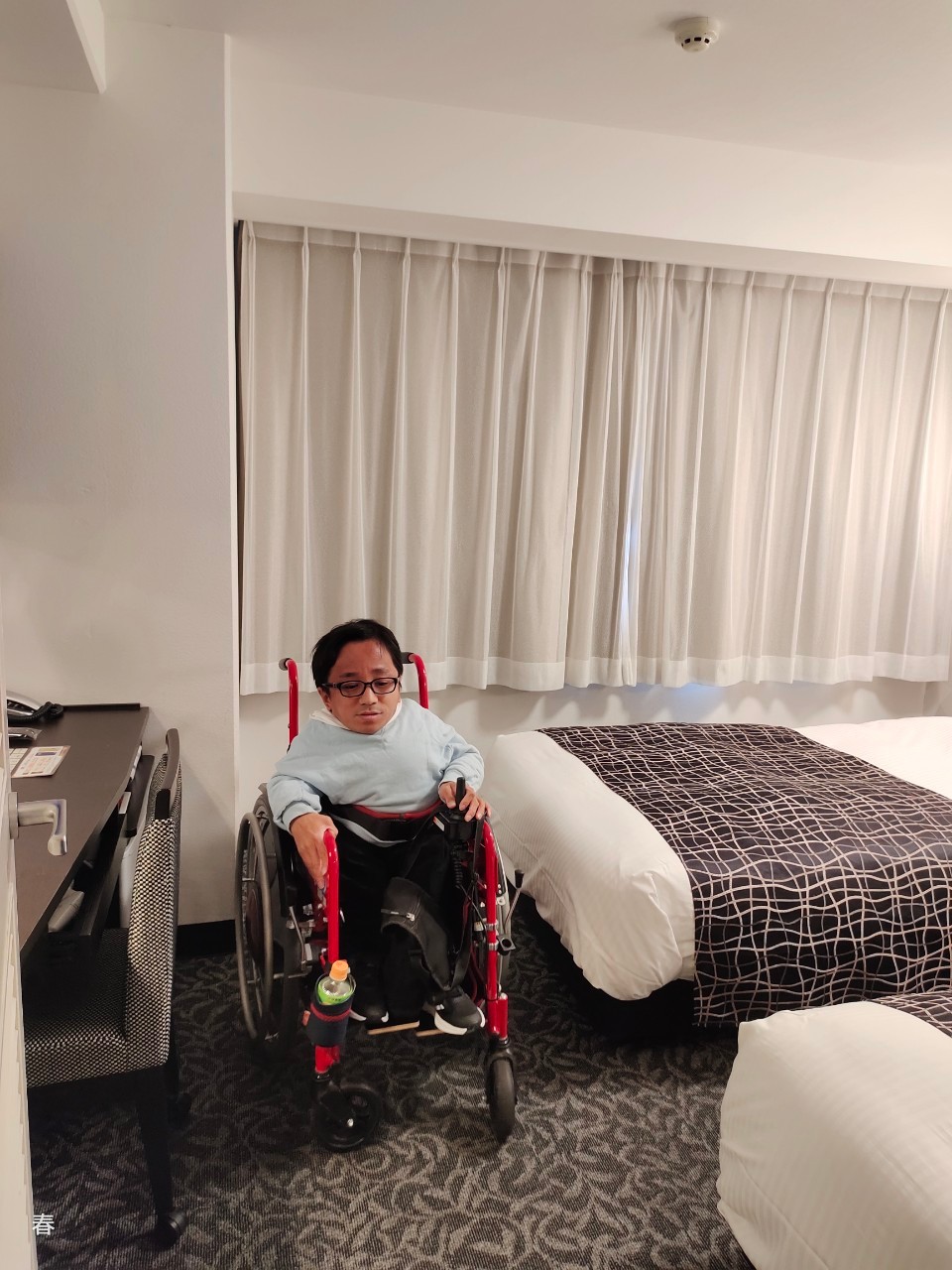 シングルルームは先程のお部屋よりも狭く、私の車椅子もギリギリ通れるくらいで回転は難しかったです。