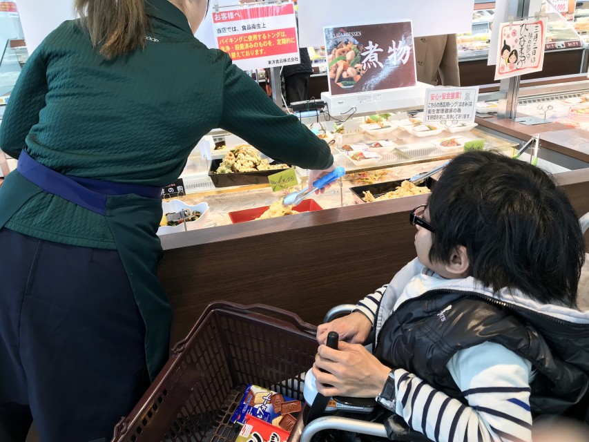 お惣菜コーナーは必ず立ち寄ってしまう場所なんですが、こちらも、トングを使って容器にお惣菜を入れるという動作がとても難しく、欲しいお惣菜を店員さんに伝えて取ってもらいます。