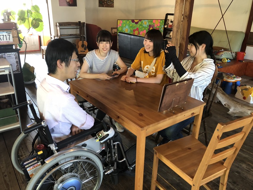 店内はテーブルが3種類ほどあり、自分にあった席をチョイスできました。丸テーブルもありましたが、フットレストとテーブルの脚がケンカしちゃいそうだったので、四角のテーブルを選びました。適度な高さがあり、私の車いすにジャストフィットです。思わず一瞬家庭を忘れて他のリポーターとの会話も弾みます!