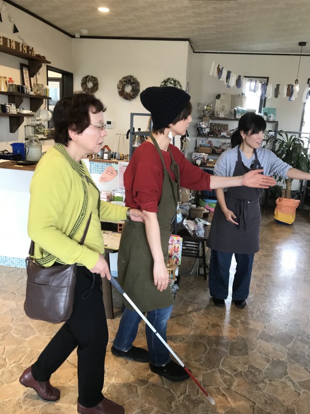 視覚障害者はしてほしいことを伝える。お店の人は声をかける。