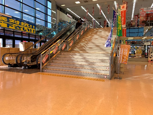 そこから入場していただくと、ご覧のとおり待ち構えているのは、階段とエスカレーターなわけです。「え・・・!?だまされた?となりゃJAR○に連絡だ」って一瞬なったとしても、残念ながらこれは広告ではないので連絡についてはご遠慮くださいまし。そうです、お店に入る方法はあるのですから大丈夫です。車は屋内駐車場のできるだけ北側に駐車されることをオススメします。写真のとおり、その付近にある「商品交換所」の表示があるところへ行くと、そこには荷物を店舗へ搬入するためのエレベーターがありますので、近くにいらっしゃるスタッフの方へ声をかけることで、そのエレベーターを利用することができます。私が今回お声かけをしたときも、わざわざお仕事の手を止めて、優しくご対応くださいました。