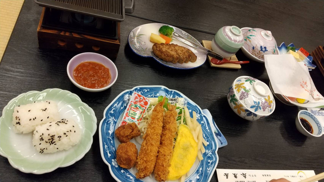 こどもが自分で焼くことができるハンバーグは、とても楽しかったようです。上の子と、下の子では、お皿の種類や料理の切り分け方も違えてあり、細かいところまで気遣いがされていました。子供のものも食べていたので、お腹が一杯になり、大人のごはんの釜飯が入らなくなったのですが、余った釜飯はおにぎりにしてくださり、お部屋でいただくことができるようにしてくださいました。翌朝、朝食まで待てない子供たちが食べていました…
