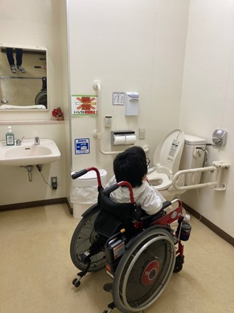 なお、多目的トイレに入るときは押すタイプですが、押すときにドアが重く少々踏ん張らないと開かないと感じました。途中から自動的にドアが開閉する珍しいドアのタイプです。素早く動かないと挟まれる危険性もあるかもと思いましたので、特に車椅子ユーザー1人で行かれる場合は注意ください。