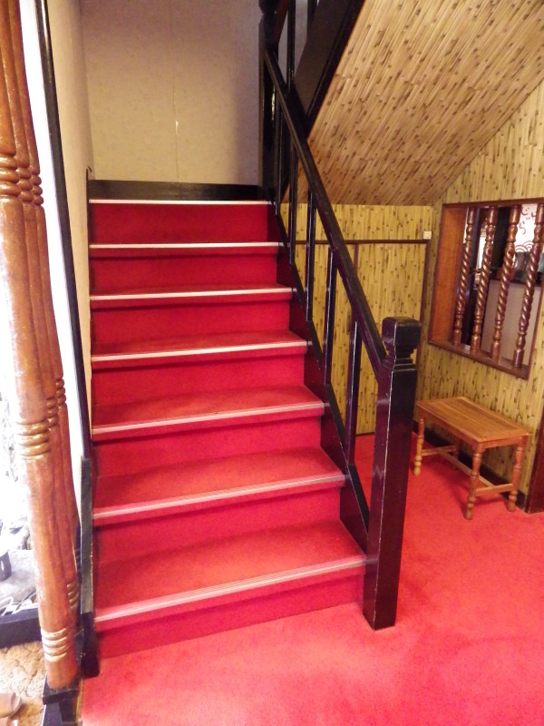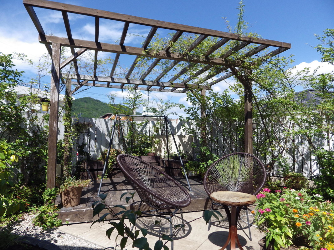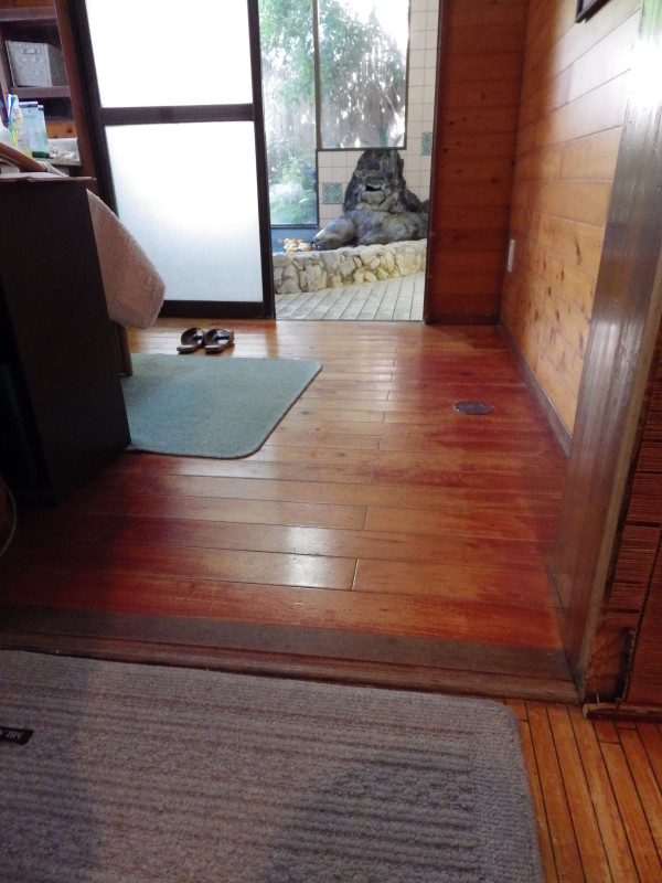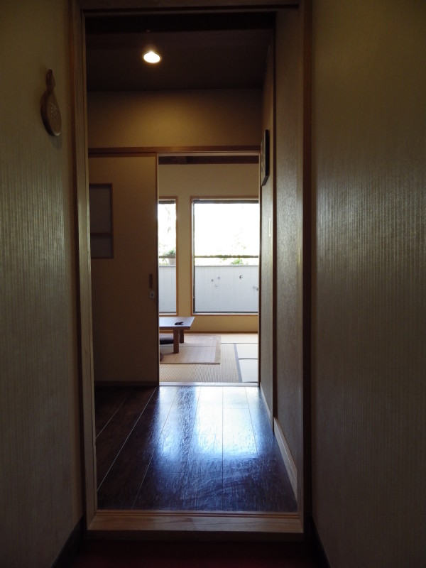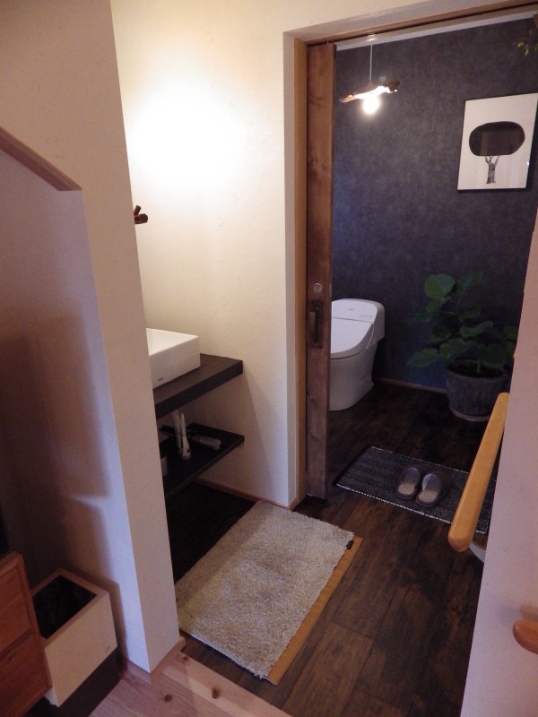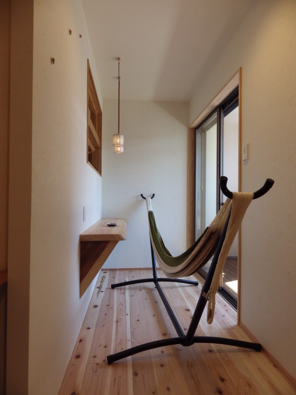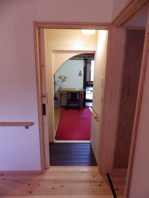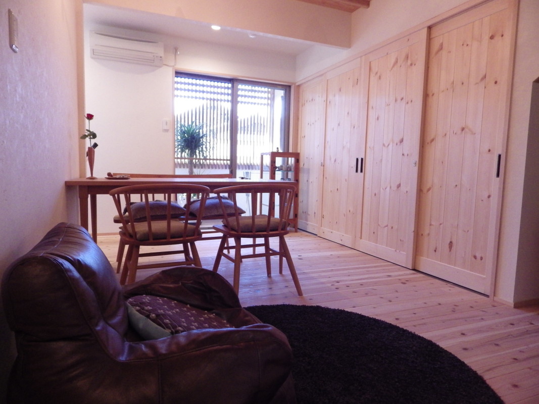 高齢者との動向も安心できるように、和洋室の洋室の方にテーブルと高座イスを設置し、食事がとりやすいようにする。歩行補助のため、手すりを必要なところに設置。