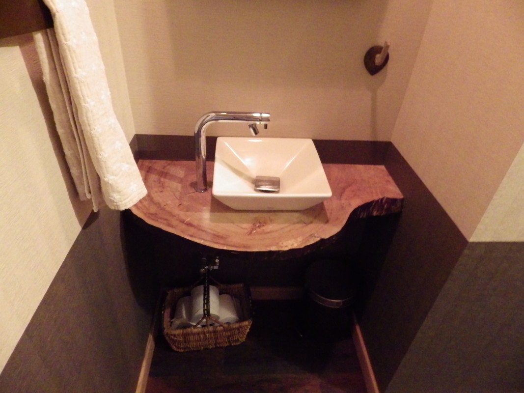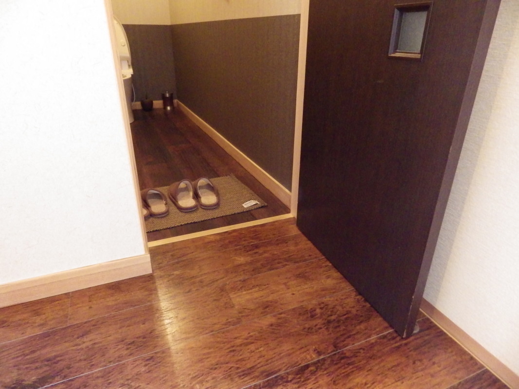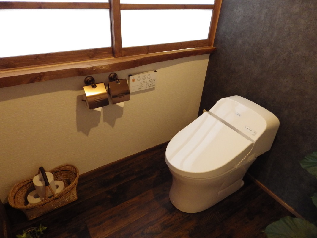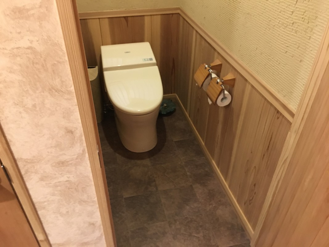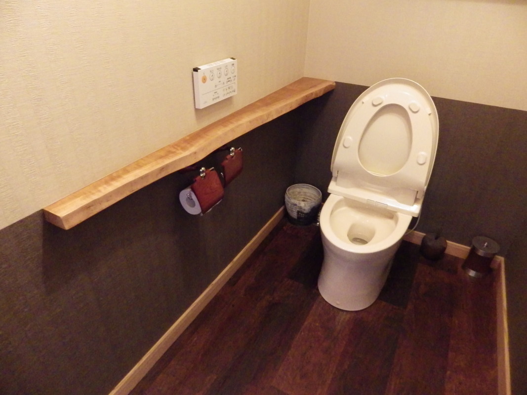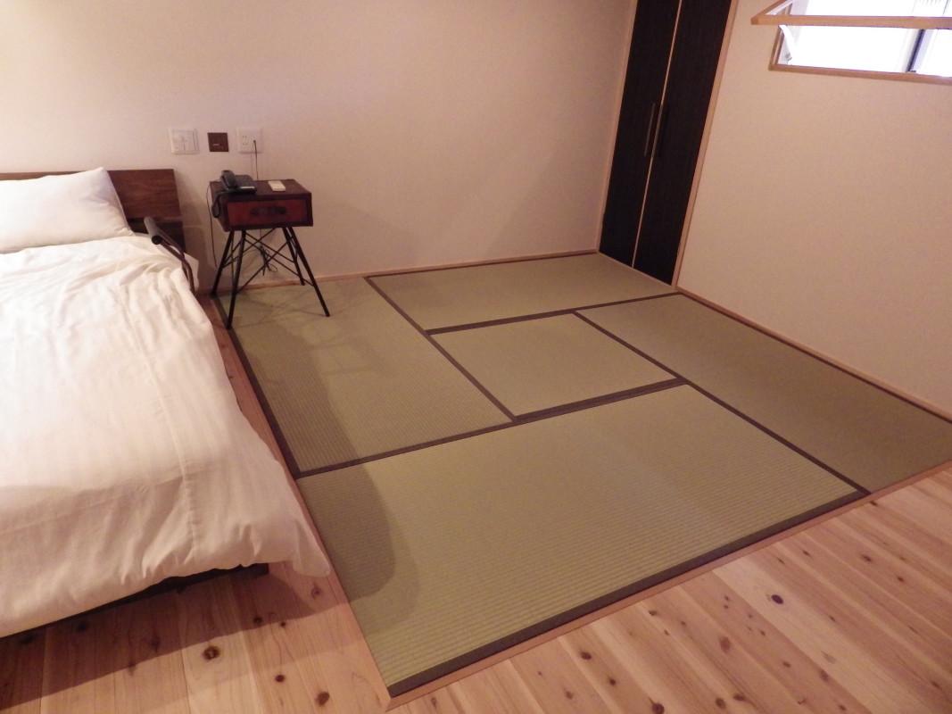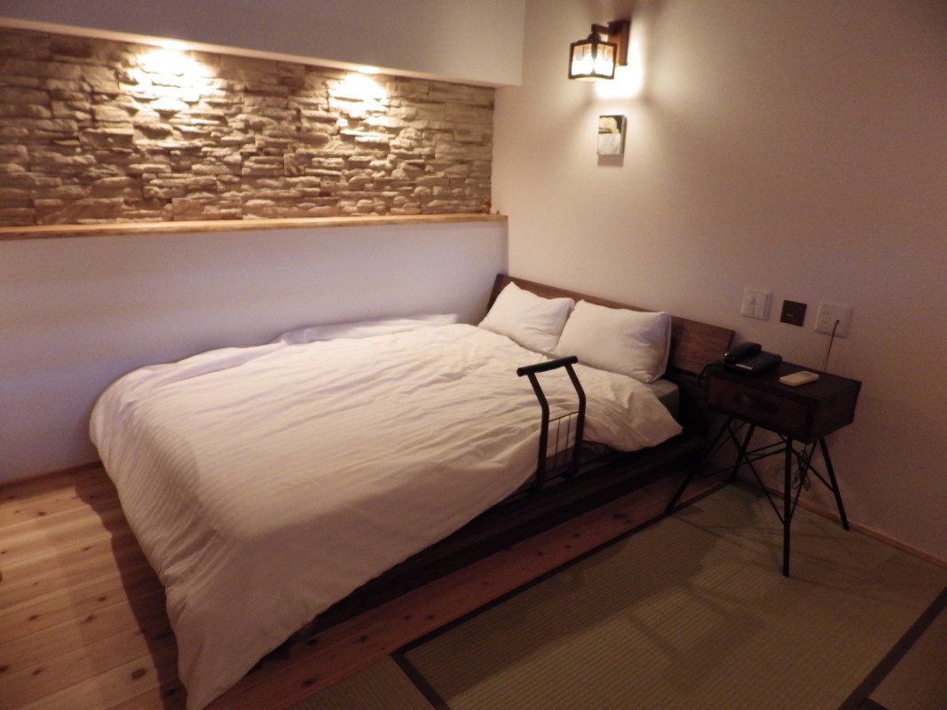 ユニバーサルデザインによる客室スタイル。和洋室(洋式トイレ付き)には立ち上がり用の腰抜設置。入口の段差をフラットにしています。和洋室の方にはダブルベットを設置。転落防止のため、ベビーガードを設置。