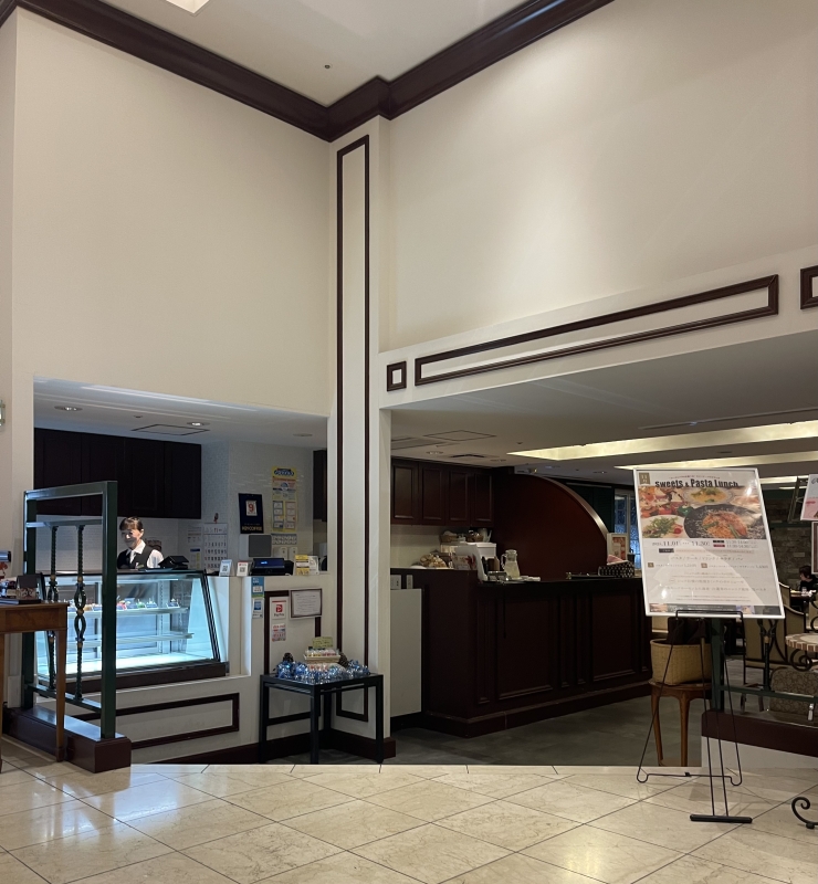 ティーラウンジはパステレリアテテのケーキをイートインとテイクアウトでき、お昼はパスタランチをご利用いただけます。