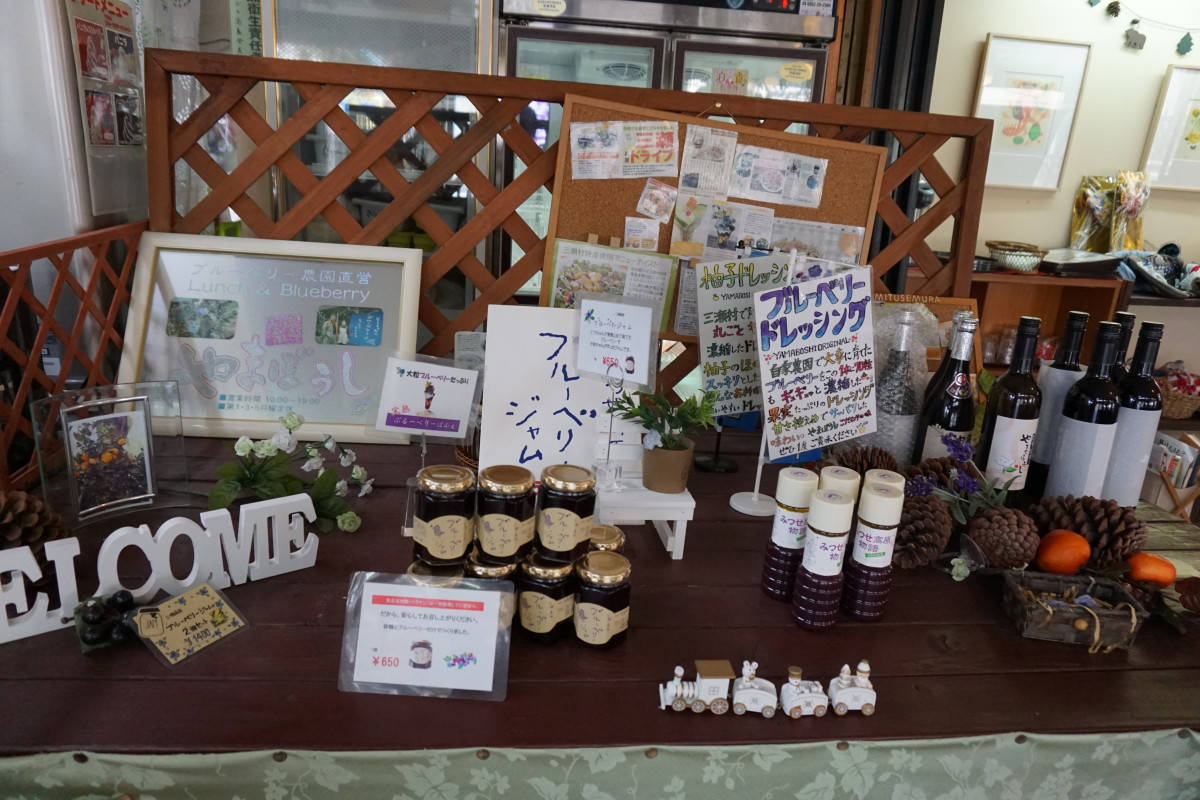 自家農国産のブルーベリーを使ったスイーツやみつせ鶏を使った料理等を提供しています。ブルーベリージャムなどの販売もありますよ。