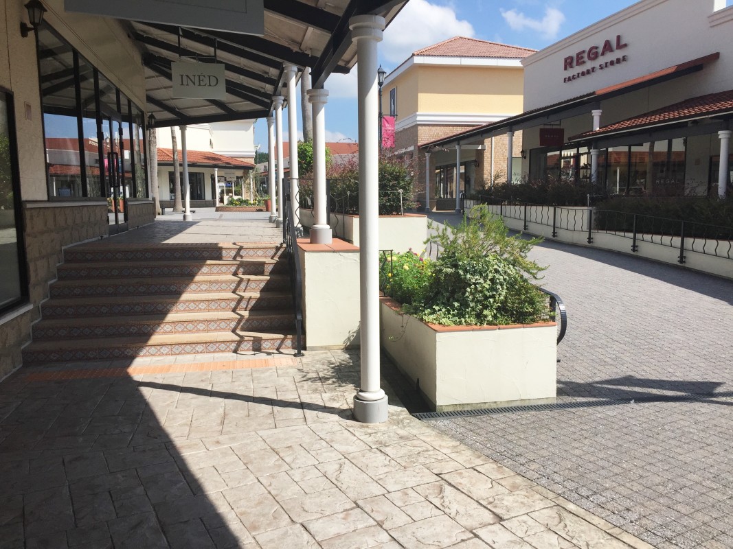 施設内の通路に階段あり。その横に緩やかなスロープが併設。