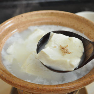 温泉湯豆腐は、口の中に入れるととろけるような豆腐の食感と豆腐の旨みが湯汁に溶け出し白濁するのが特徴の嬉野温泉の名物料理です。
