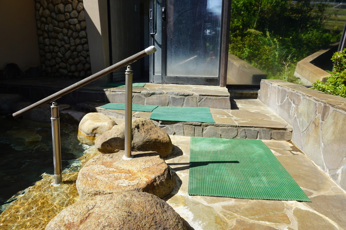 大浴場1にサウナへ向かうところ(1段)、露天風呂へ向かうところ(2段)段差あり