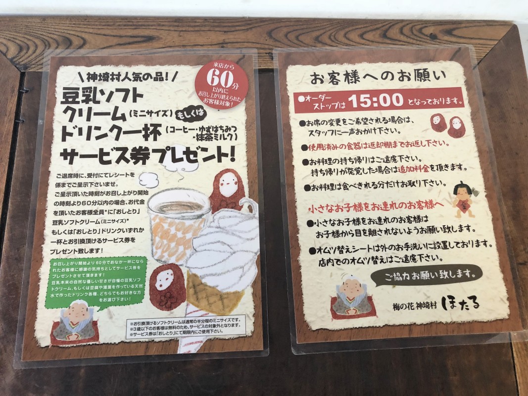 60分以内にお食事が済まれた方へ、とうふ・ゆば工房「おしとり」で利用できる豆乳ソフトクリームもしくはコーヒーの無料サービス券あり。「おしとり」にてご提示ください。