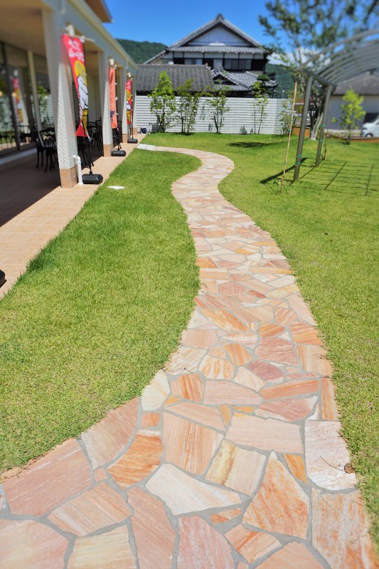 庭を通るゆるやかなスロープあり。トイレ、カフェスペース側の入り口より入店できます。