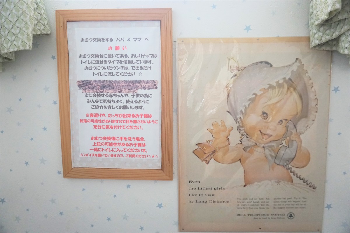 敷地内への入り口は傾斜になっておりますのでお気をつけください。店舗前はスロープがあり入店しやすいです。お子様用の手洗い場やキッズスペース、おむつ交換台、トイレの中にベビーキープと着替える台など設置しています。