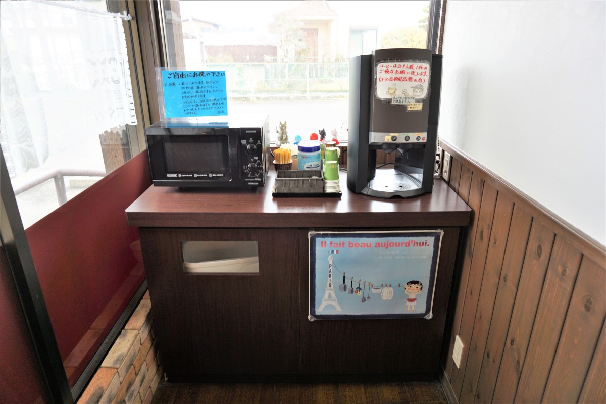 テラスにはイートインスペースあり、お手拭用濡れティッシュ設置しています。