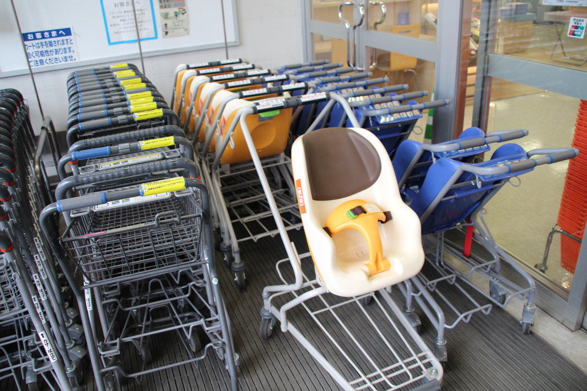 店内はフラットで、お子様連れの方にも安心してお買い物ができるよう、お子様用のカートも準備しています。