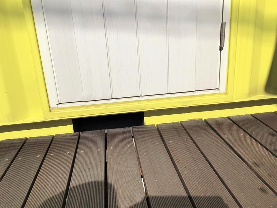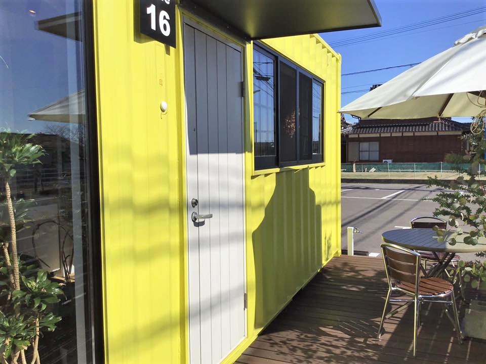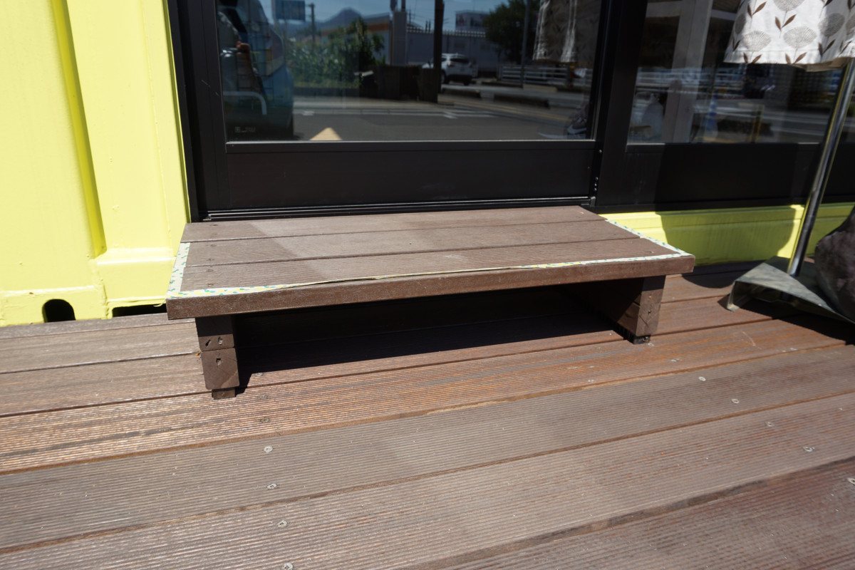建物はコンテナを利用したものです。駐車場からコンテナ入り口まで、2段の段差があり、入り口は2箇所ございます。カフェはソファ席とカウンター席のみです、一度お写真をご確認ください。
