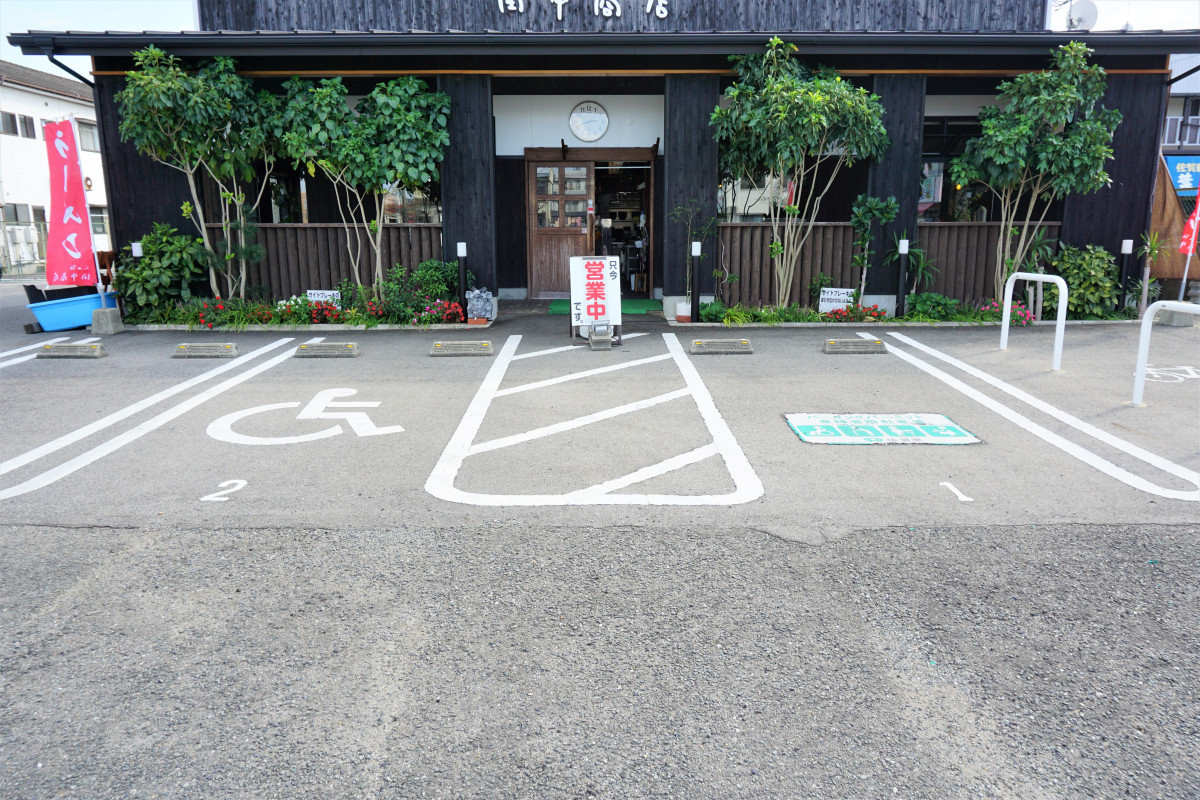 お子連れやご高齢の方、車いすの方など、車の乗降がしやすいように駐車場を広く取っています。パーキングパーミット、身障者等用駐車場も1台ずつ店舗入り口前にございます。お座敷あり、テーブル席あり、段差なく店内へスムーズに入店できます。