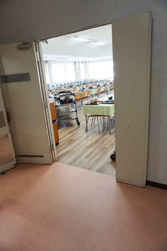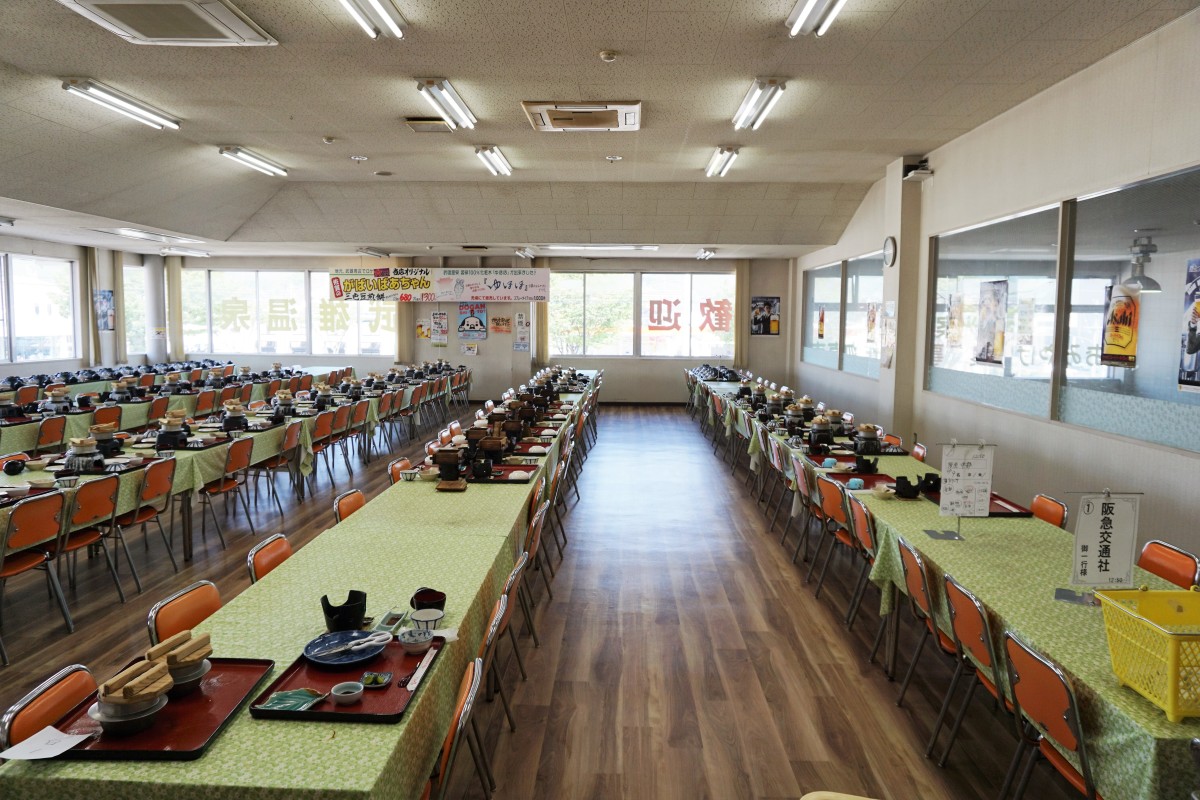 食事処は1階、2階にあります。2階へは階段のみ。最大350人収容可能。