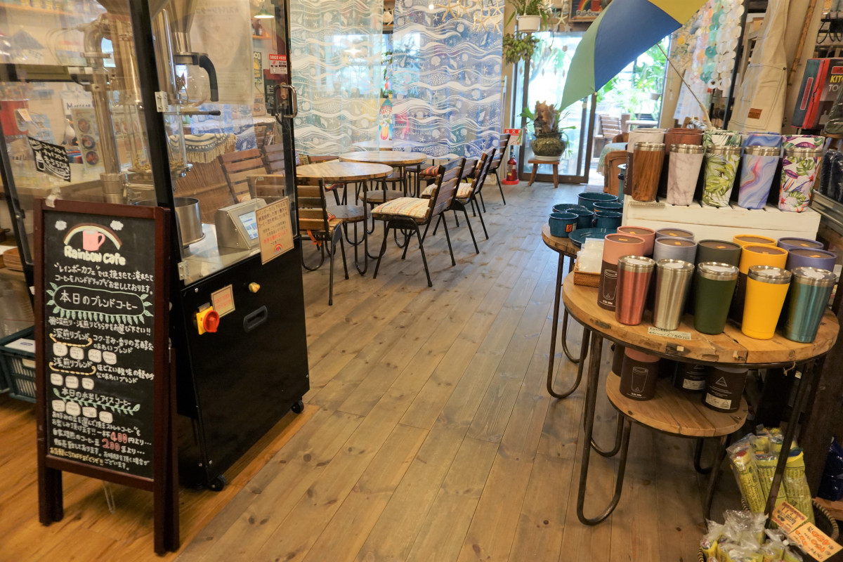 エスニックな雰囲気の雑貨店の中に、ハワイアンテイストなカフェ「Rainbow cafe」が併設されています。まるで海沿いのカフェでランチやコーヒータイム気分で、タコスや焼き加減もお客様の好みで1枚1枚丁寧に焼くワッフル、ガーリックシュリンプなどのお食事やデザートを食べることができます。自家焙煎機で焙煎された豆の購入も可能!!テイクアウトも行っていますので、ご自宅でもお楽しみください。