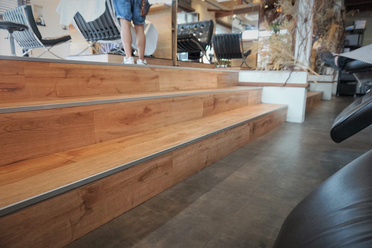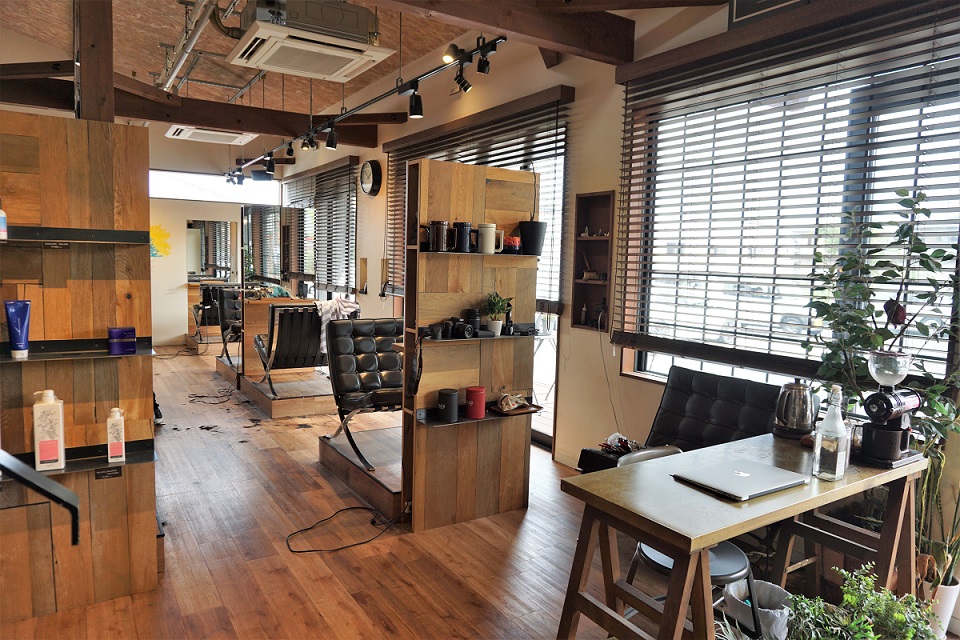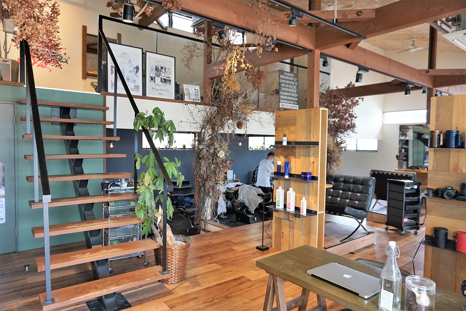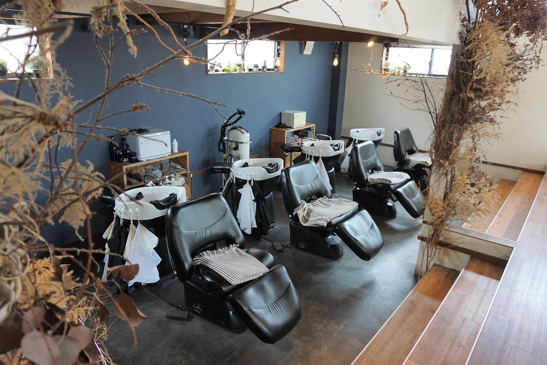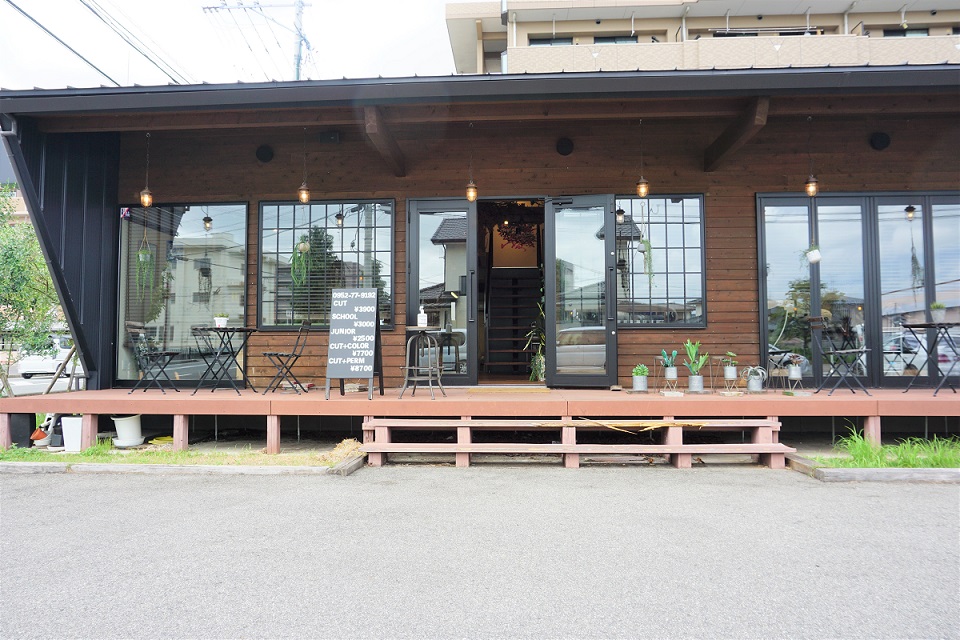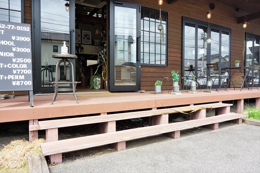店舗入り口の前にはウッドデッキがあり入店までに3段の段差があります。屋内は解放感たっぷりの空間が広がります。カット面やシャンプーコーナーへの通路、トイレに段差があります。必要な方はできる限りお手伝いいたしますので、お声掛けください。