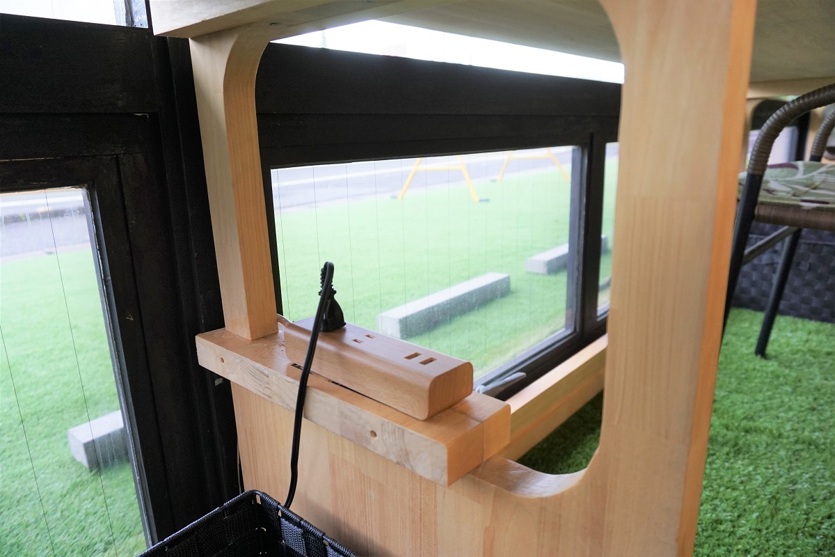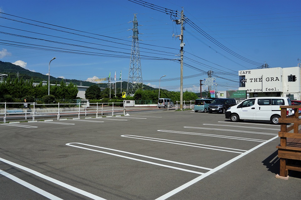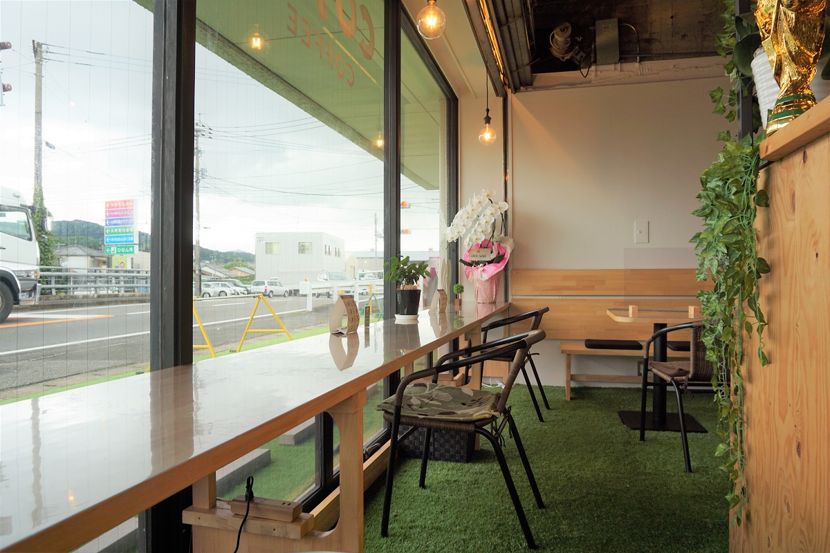 23台駐車可能。駐車場隣には遊具を設置した人工芝の広場「キッズラボ」あり。駐車場から店舗入り口までは歩道を通り店舗へ。入口の前に1センチほどの段差あり。トイレ出入口の幅が少々狭いため、一度お写真でご確認ください。店内は人工芝を敷き詰めたフロア。テーブル席、カウンター席、テラス席、トレーラーハウス(要予約)あり。テイクアウト可能。