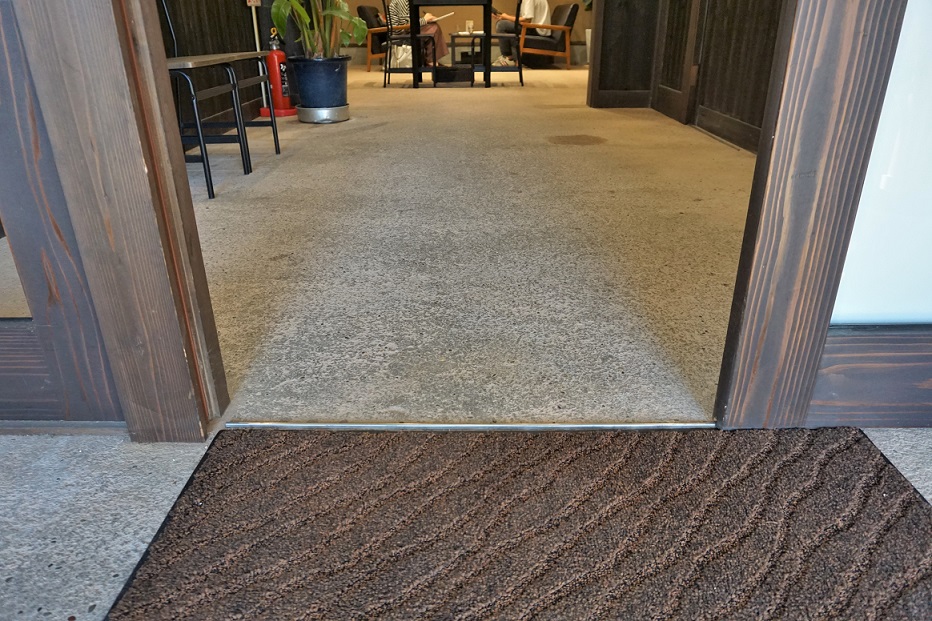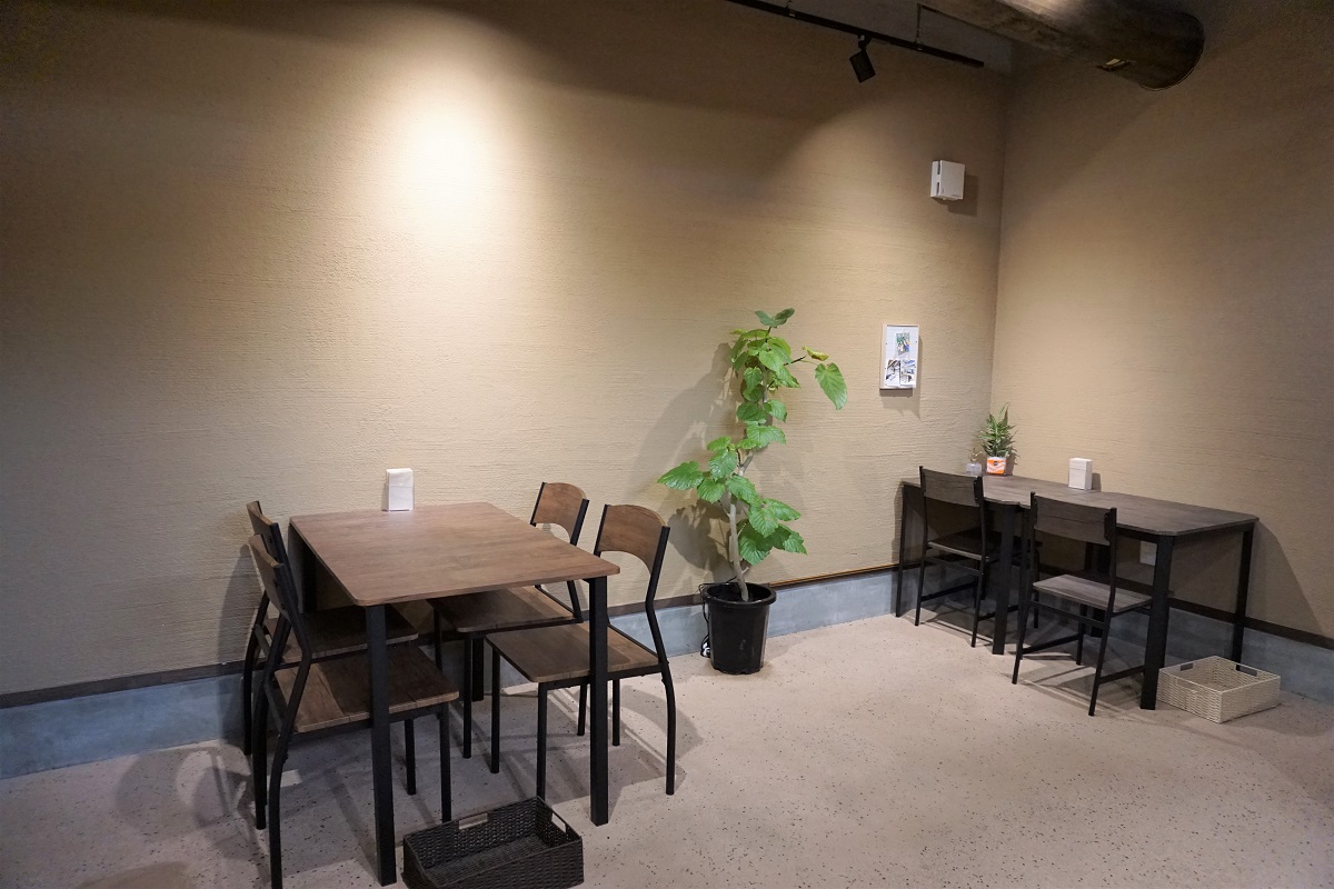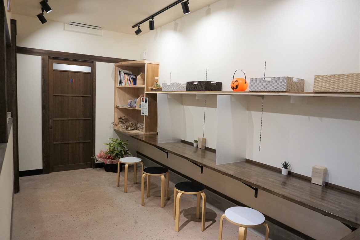 店舗前は道が細いため、交通に十分にお気を付けください。駐車場は店舗横(舗装なし)にあります。店内はフラットで、広く開放的です。勉強やテレワークなどに利用しやすいカウンター席もございます。店舗の裏には人工芝のあるスペースがあり、テラス席になる予定。テイクアウトの利用も可能です。