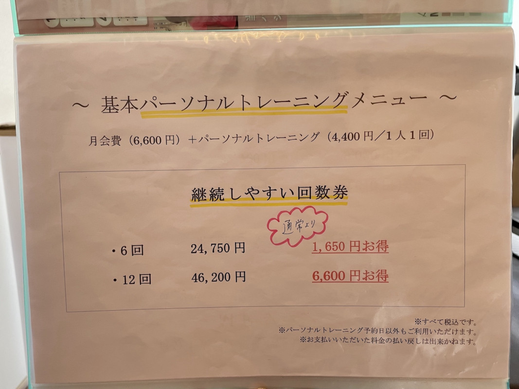 ・利用料は口座引落とし/パーソナルトレーニングは1回ごと現金または回数券