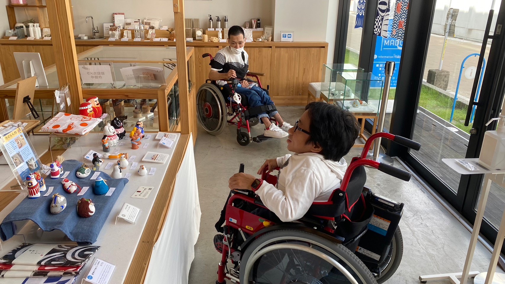 店内はフラットで、通路幅も広く、車いすやベビーカーでも安心してお買い物していただけます。