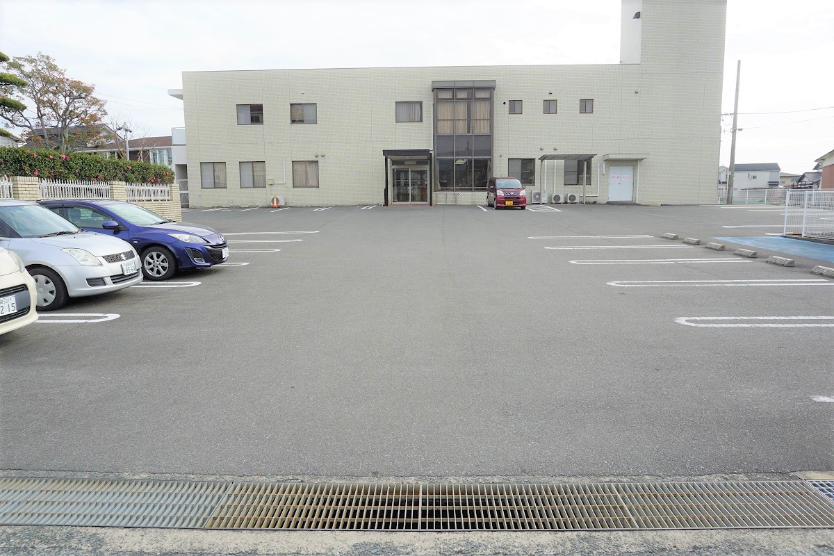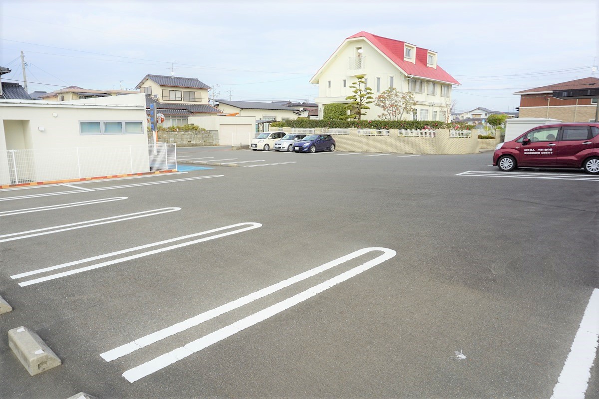 バリアフリー駐車場があり、出入り口前には屋根を設置しています。