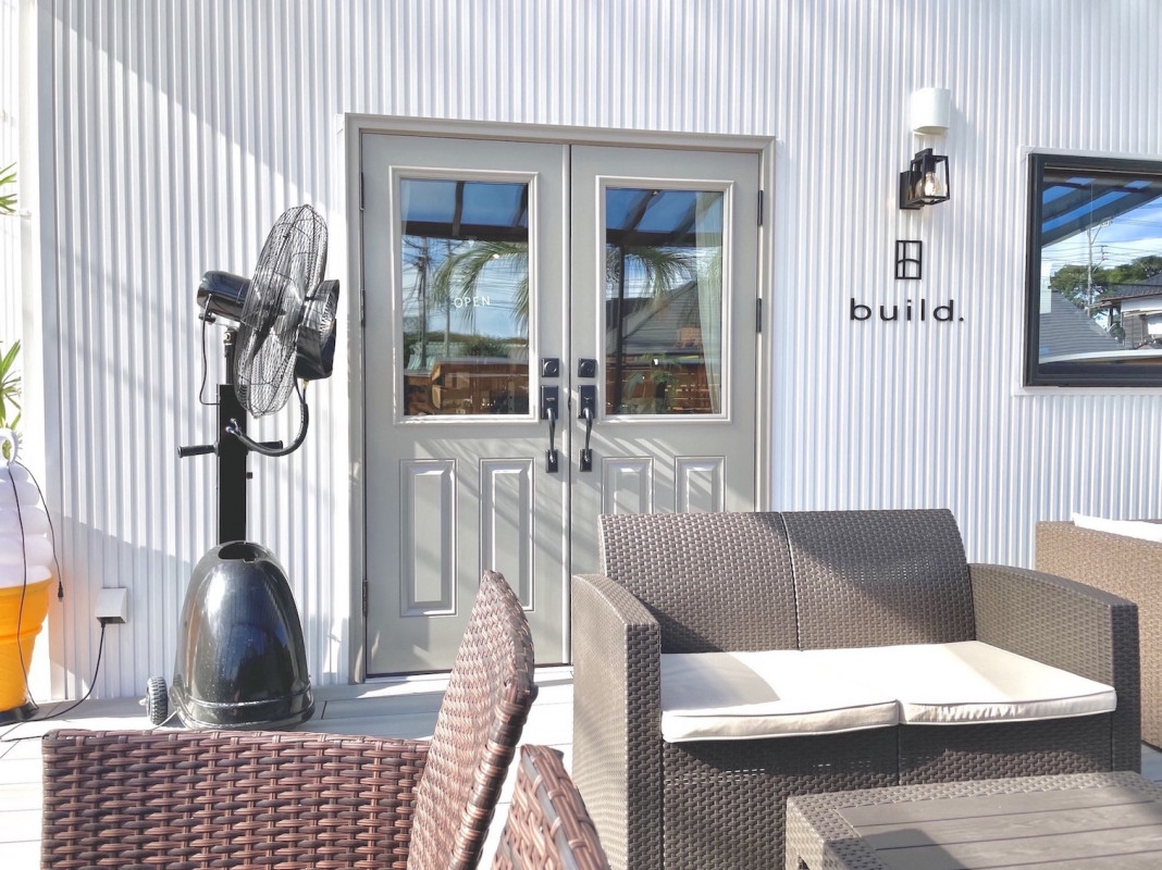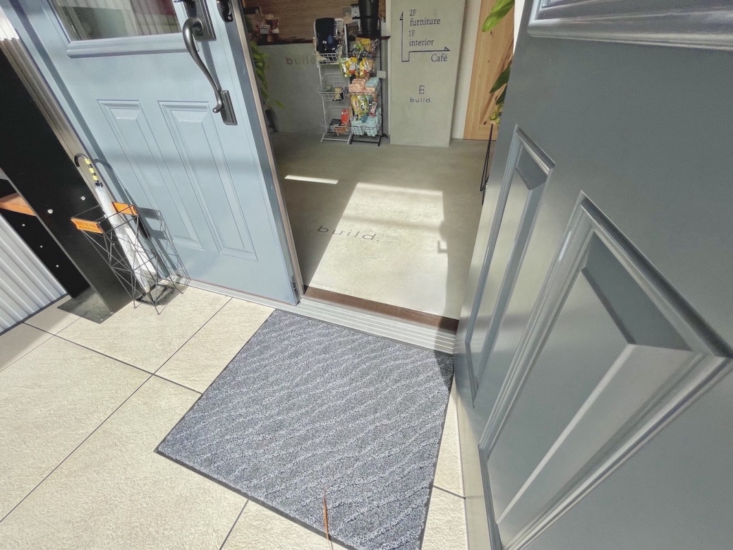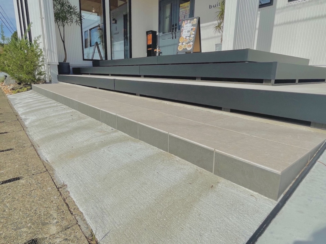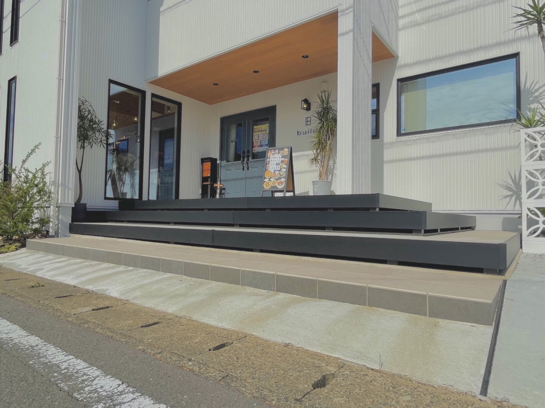 出入り口は正面とテラス席側の2箇所あり、どちらも階段がございます。