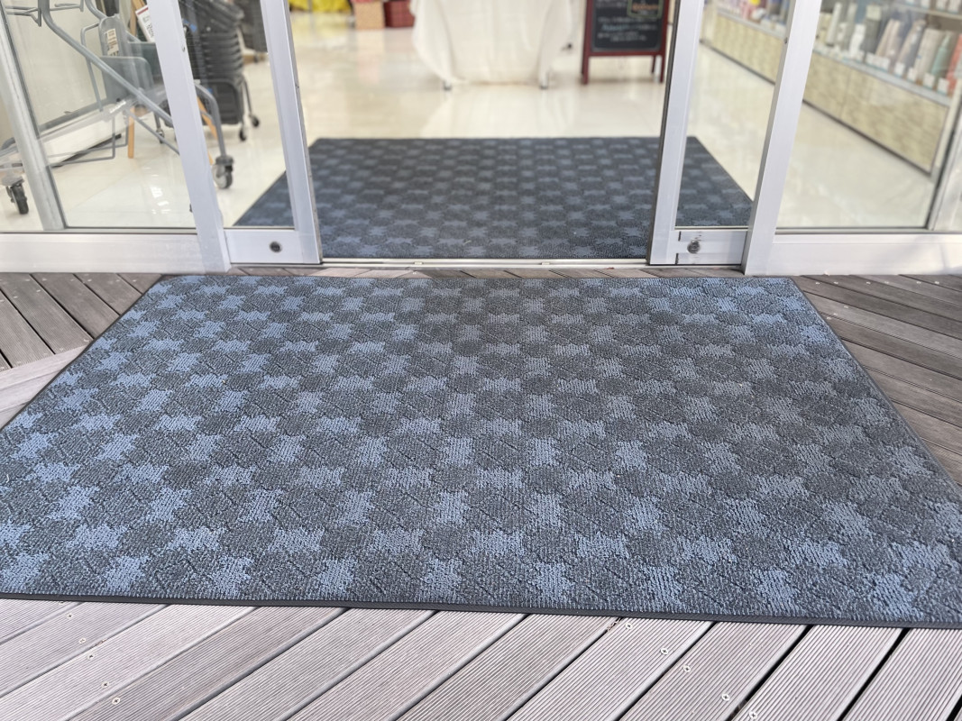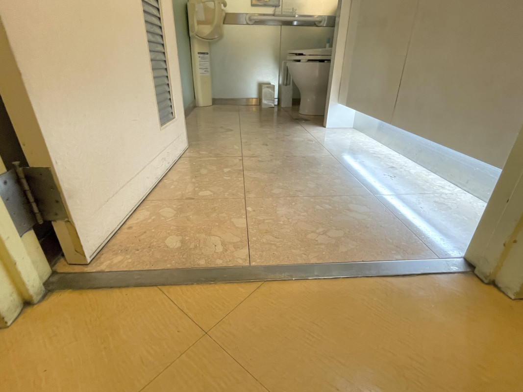 出入口前の地面がタイルと木目になっているので、小さな溝がございます。