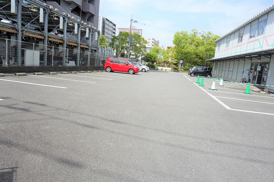 スロープ横の緑のコーンで囲まれた箇所は駐輪場となっております。