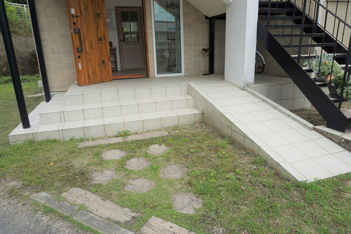 出入口には3段の階段がありますが、スロープがあるので、ベビーカーや車いすの方もスムーズにご入店いただけます。