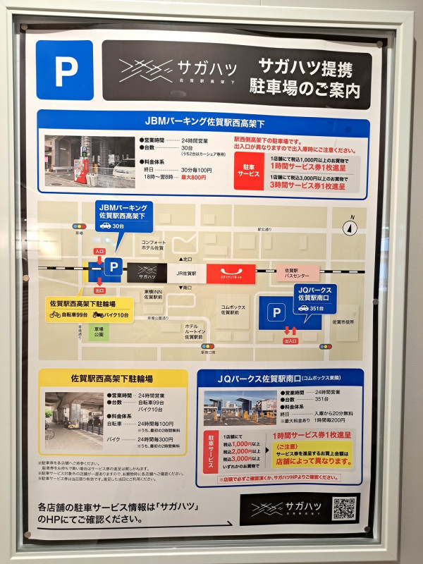 提携駐車場はJQパークス佐賀駅南口とJBMパーキング佐賀駅西高架下の二つです。