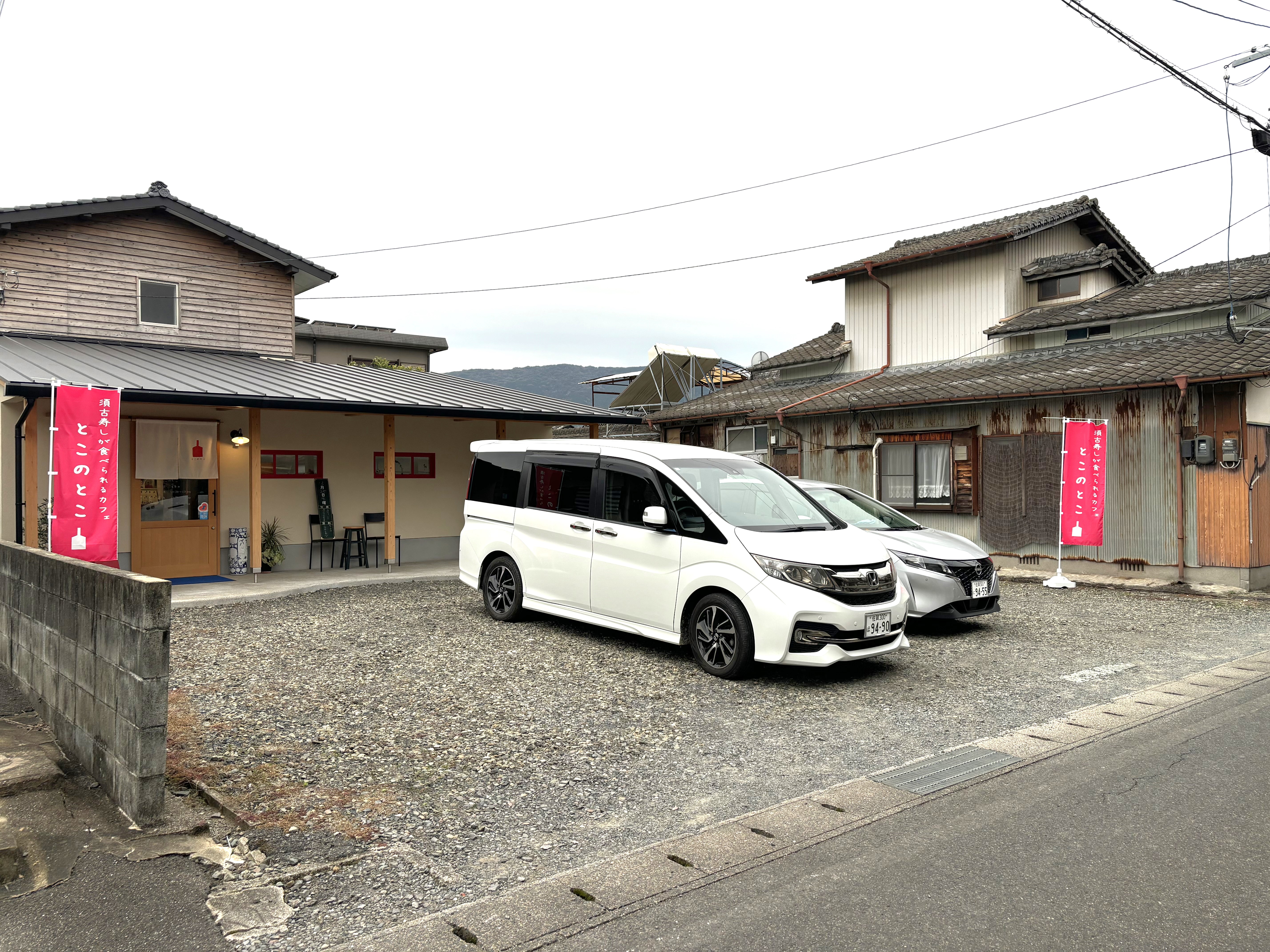 駐車場は敷地内に6台とめれます。店舗前と店舗横に縦列でおとめください。