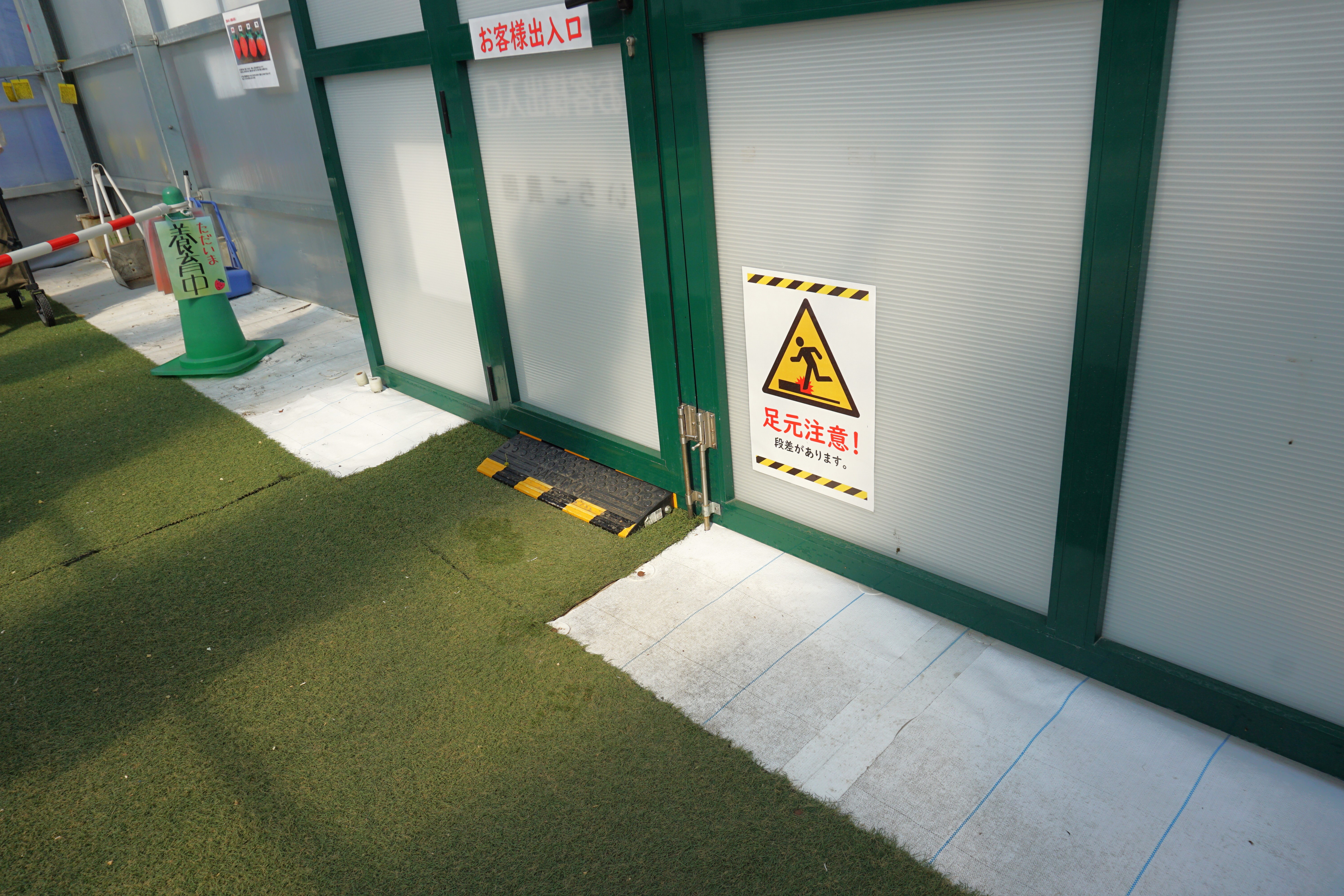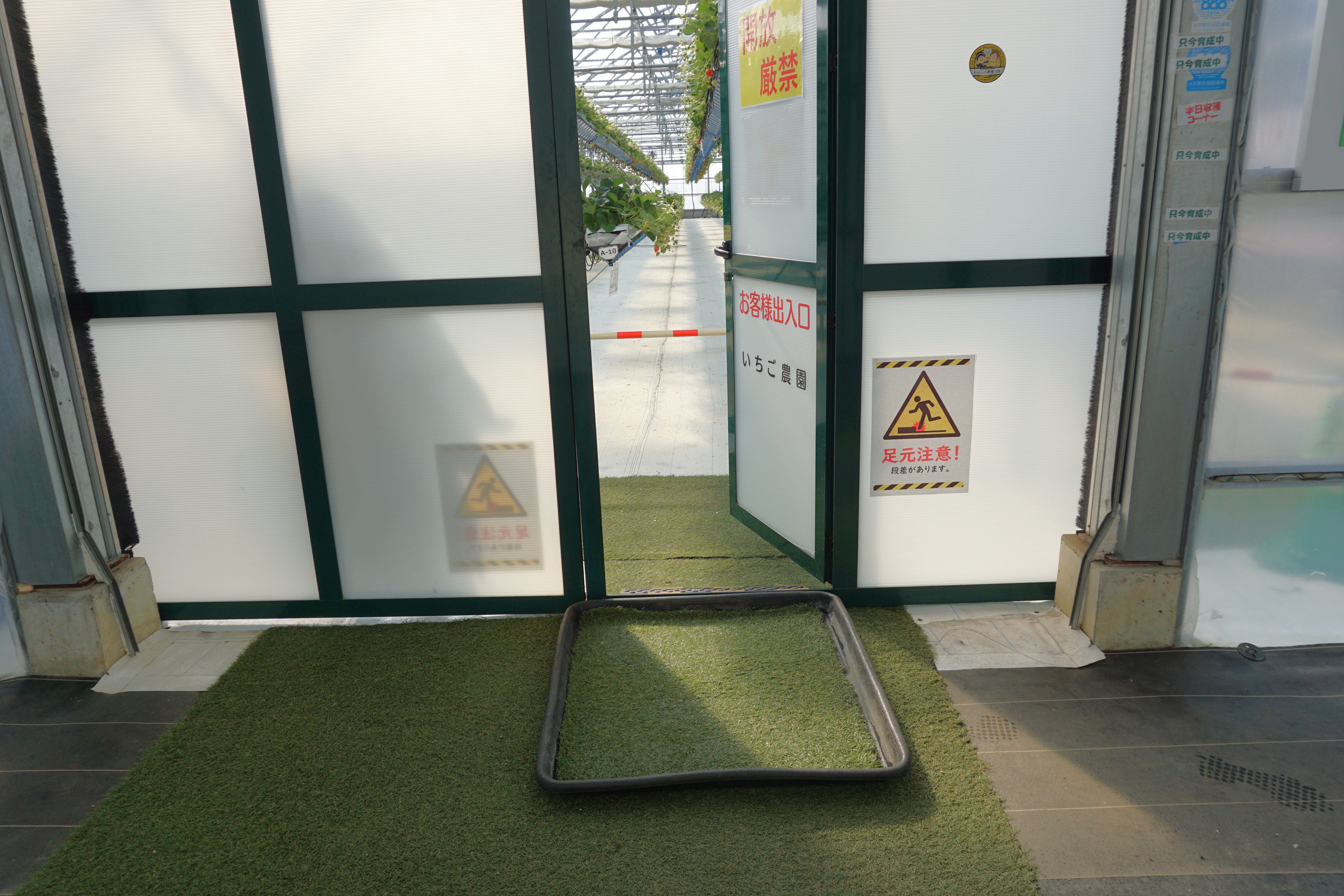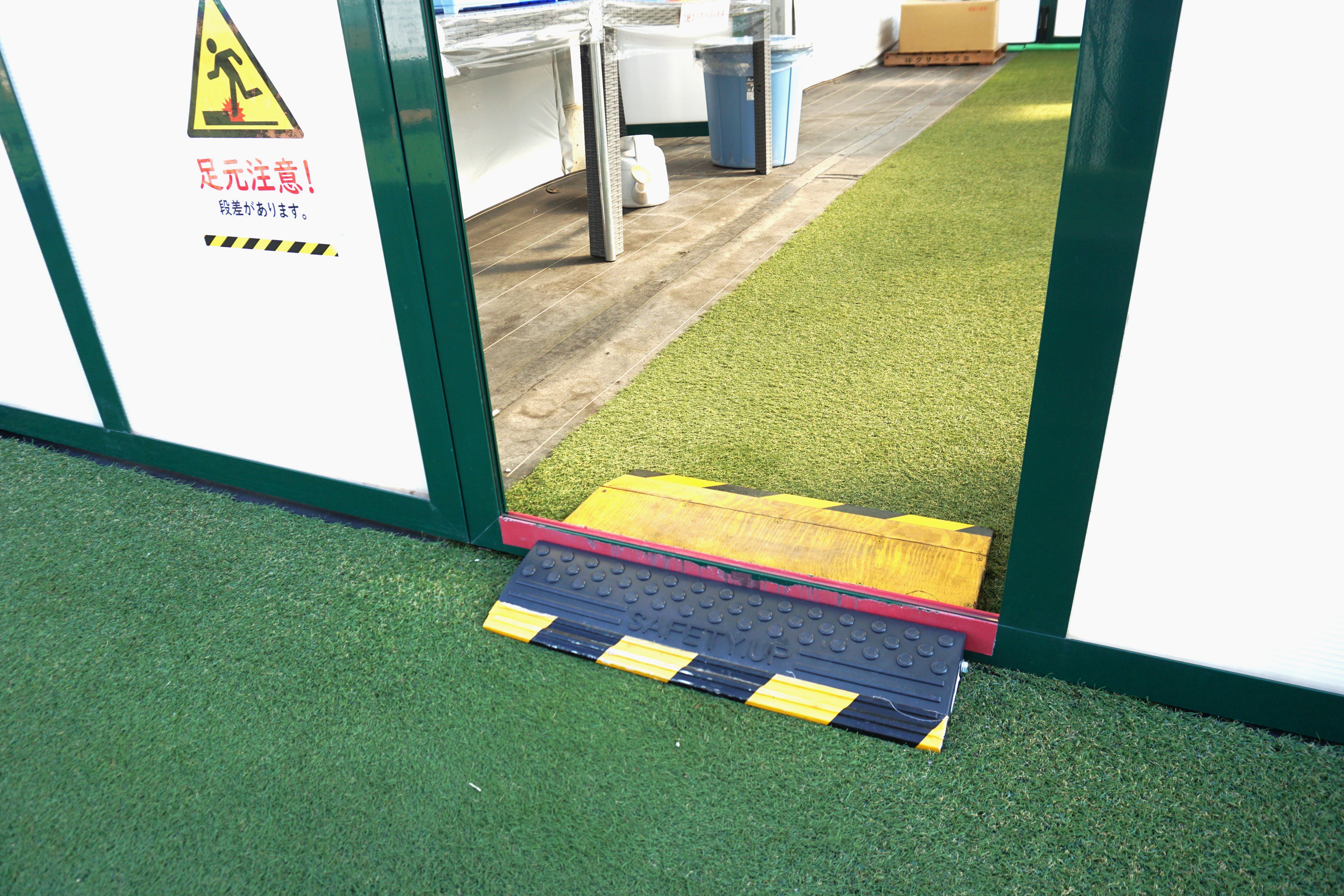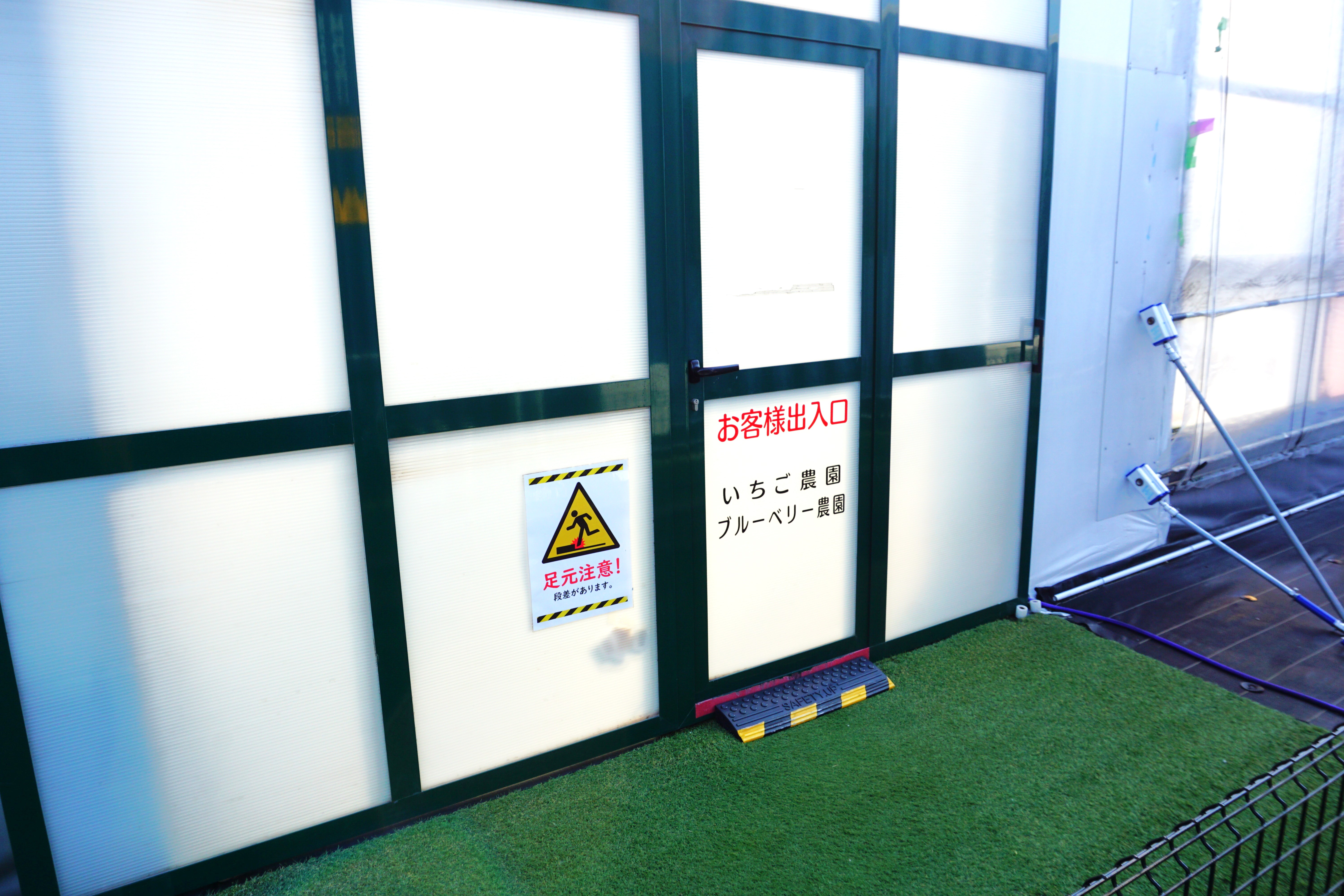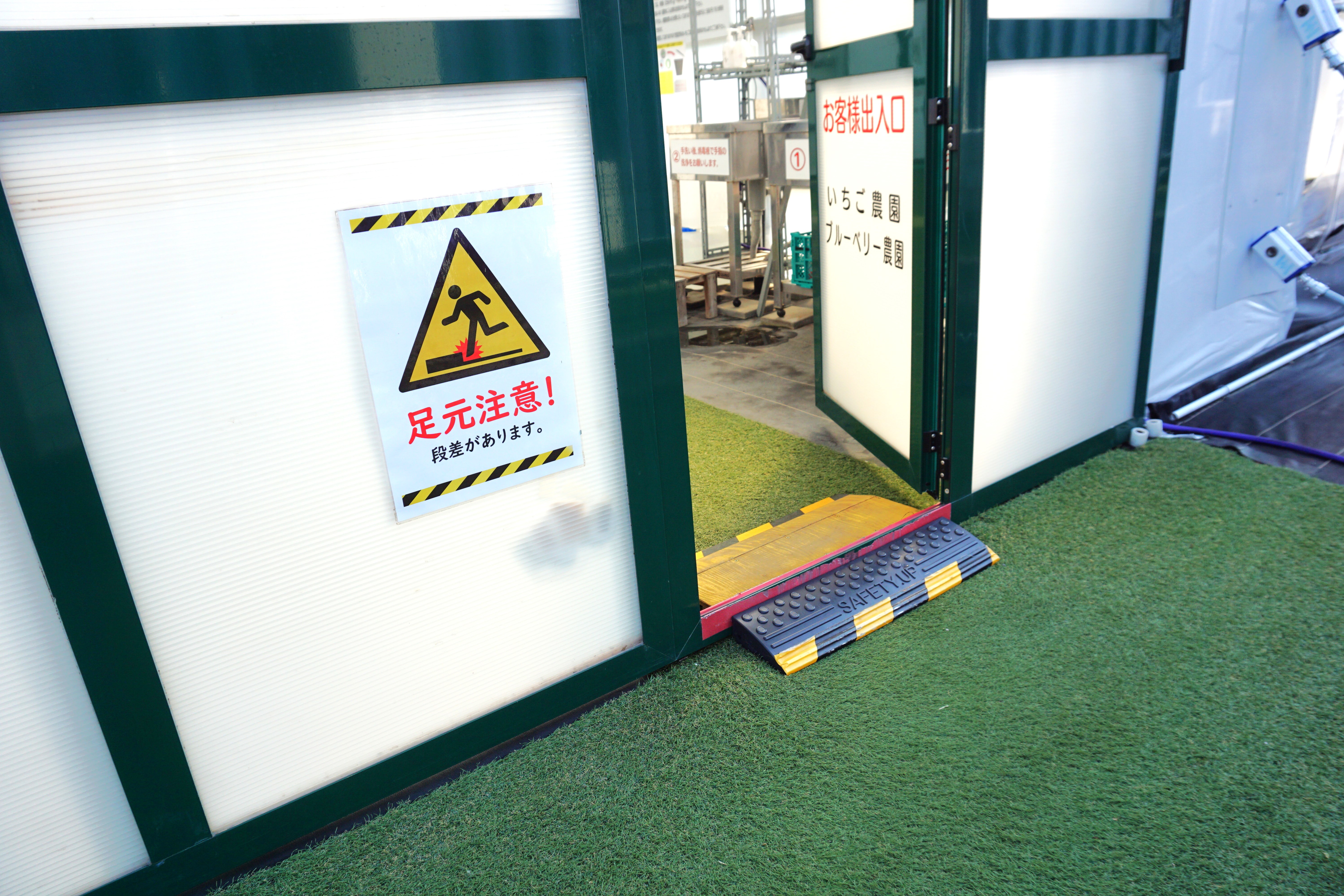 いちご狩りのハウス出入口に簡易スロープ設置しています。