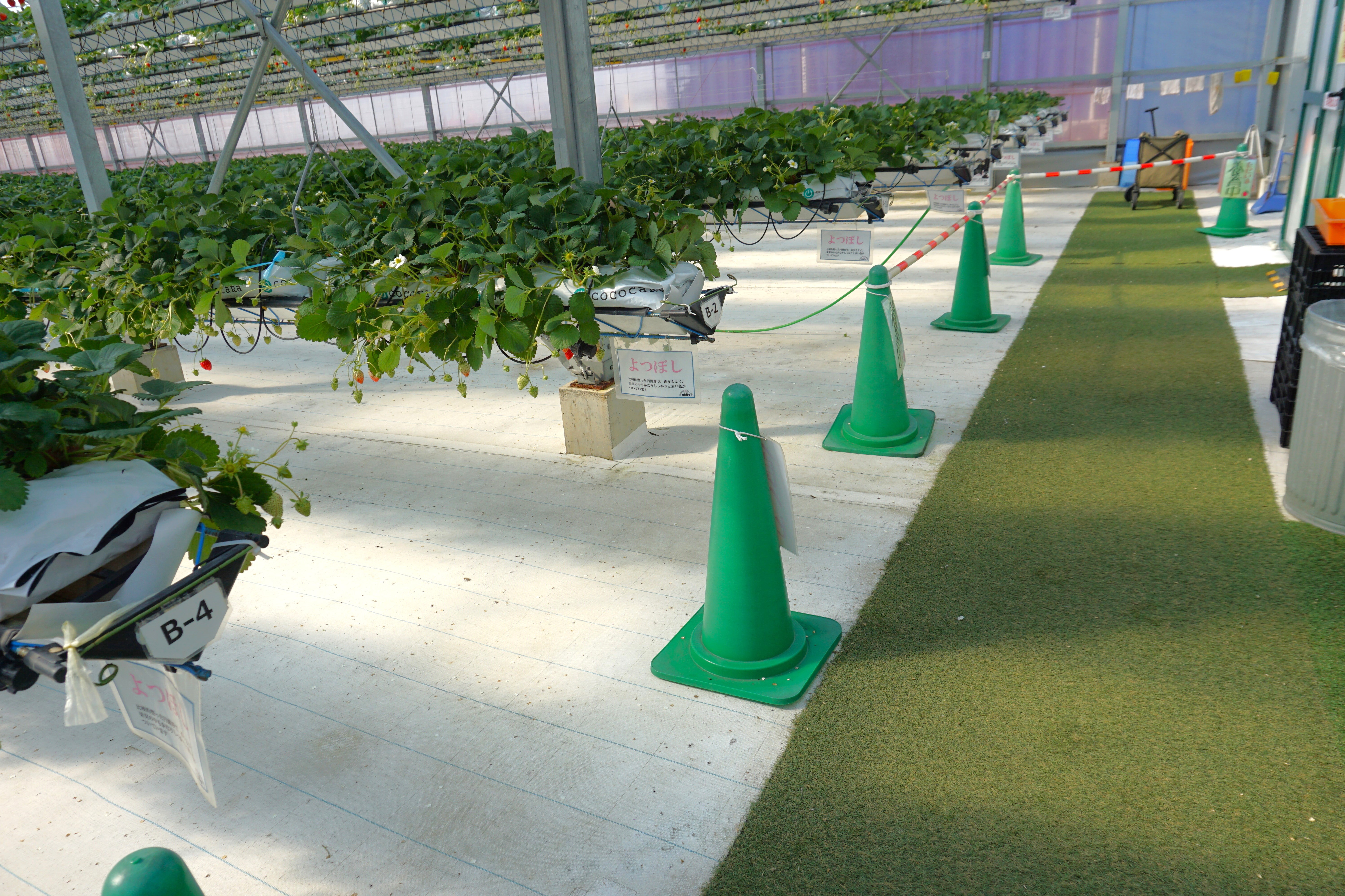 地面には全面シートが張ってあるので、車椅子をご利用の方やベビーカーのままでもいちご狩りが楽しめます。