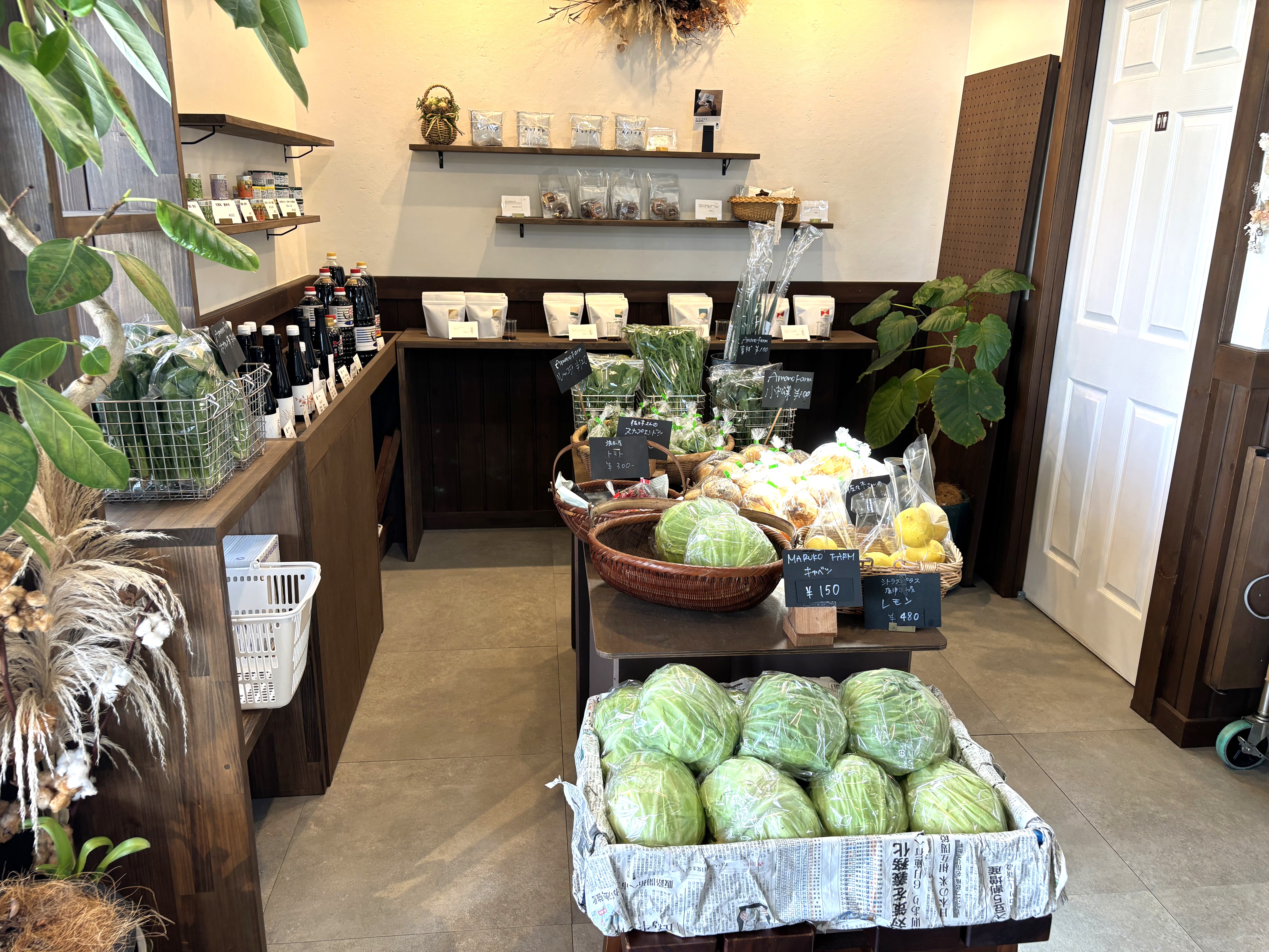 店内には、自社農園で栽培された新鮮な野菜の販売コーナーがあり、新鮮なお野菜を購入できます。