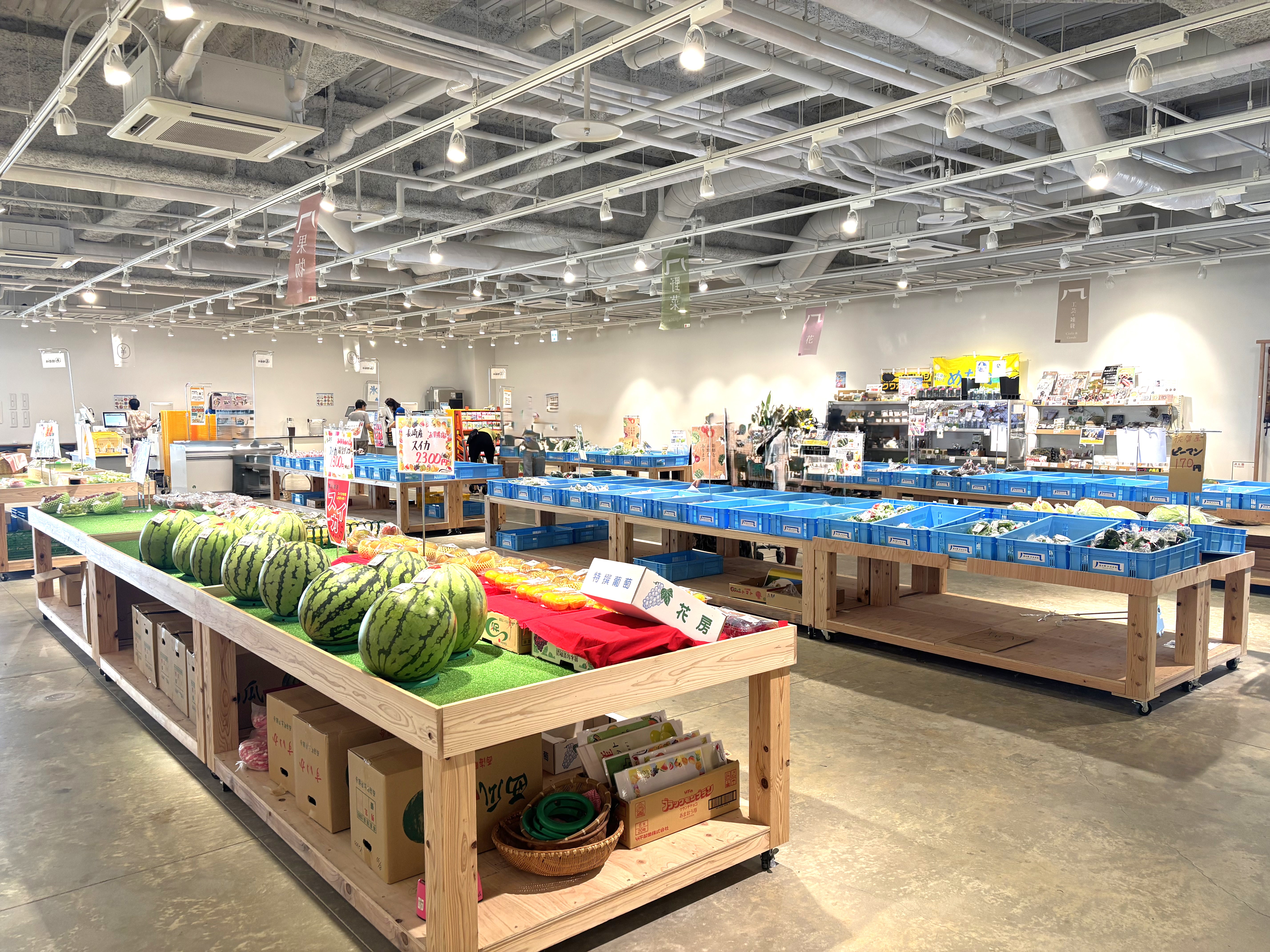直売所には新鮮な農作物や精肉が並び、魅力的なメニューあふれるフードコートやグルメが揃うテナントエリアなど、県内最大級の規模を誇ります。