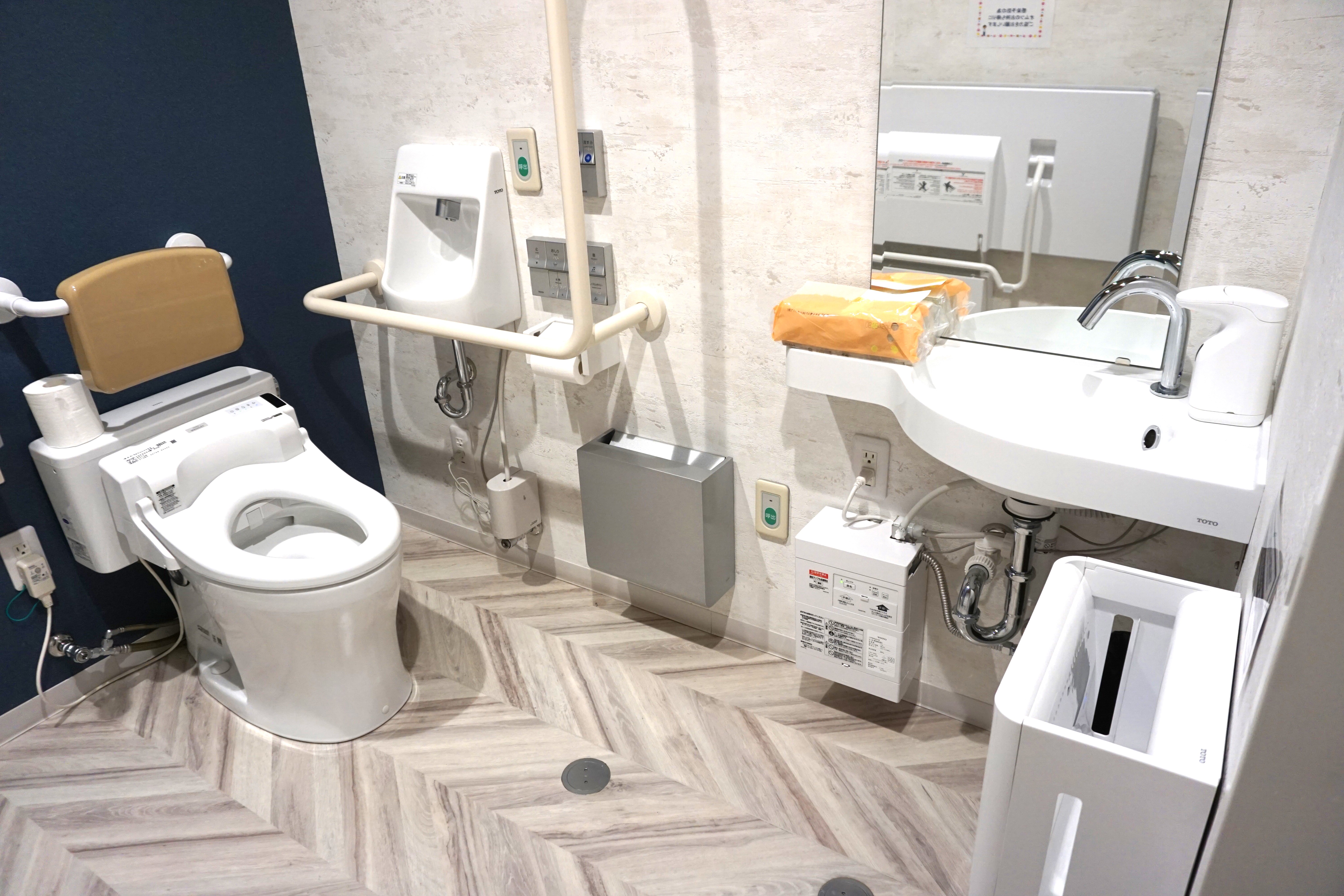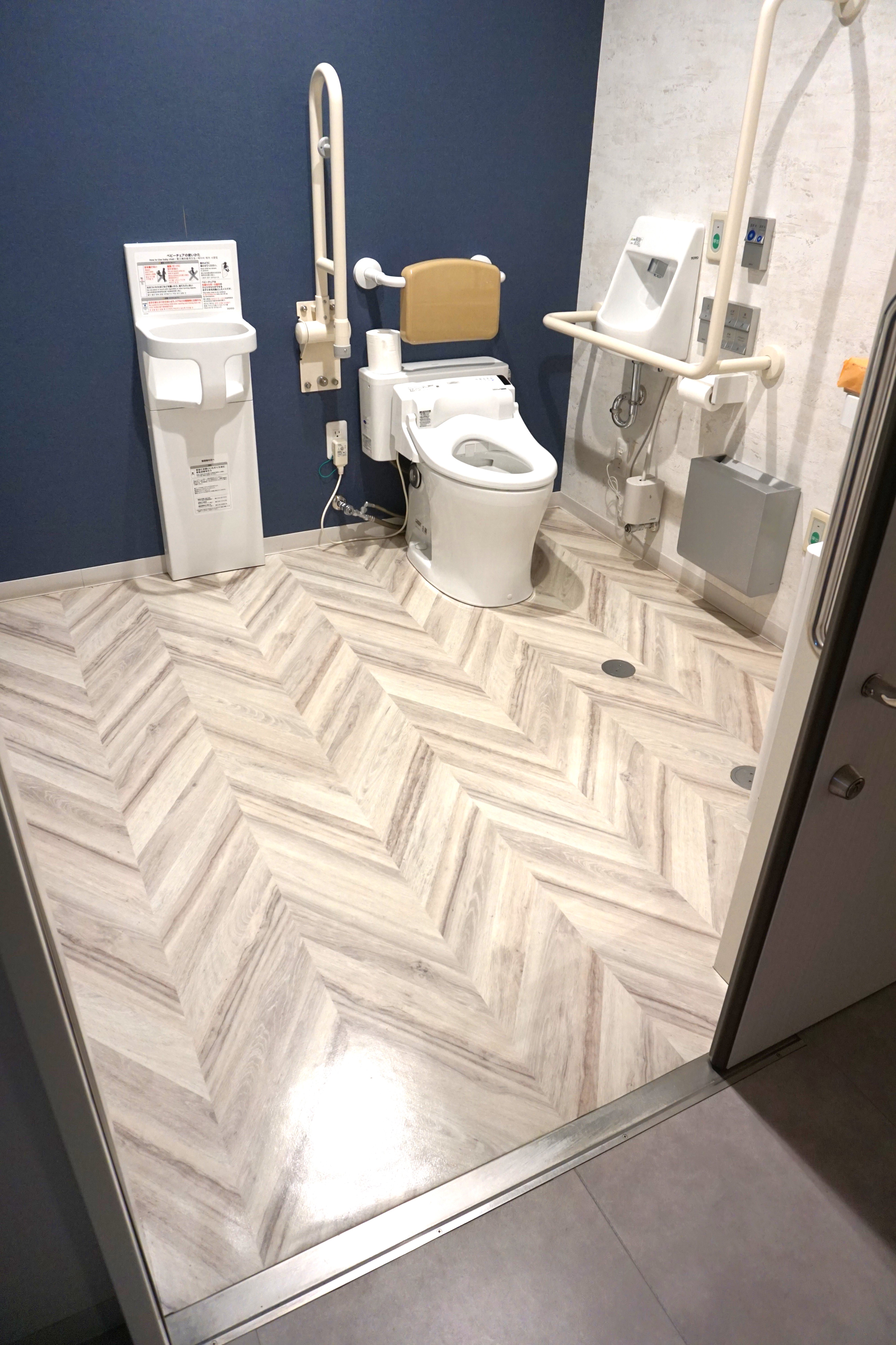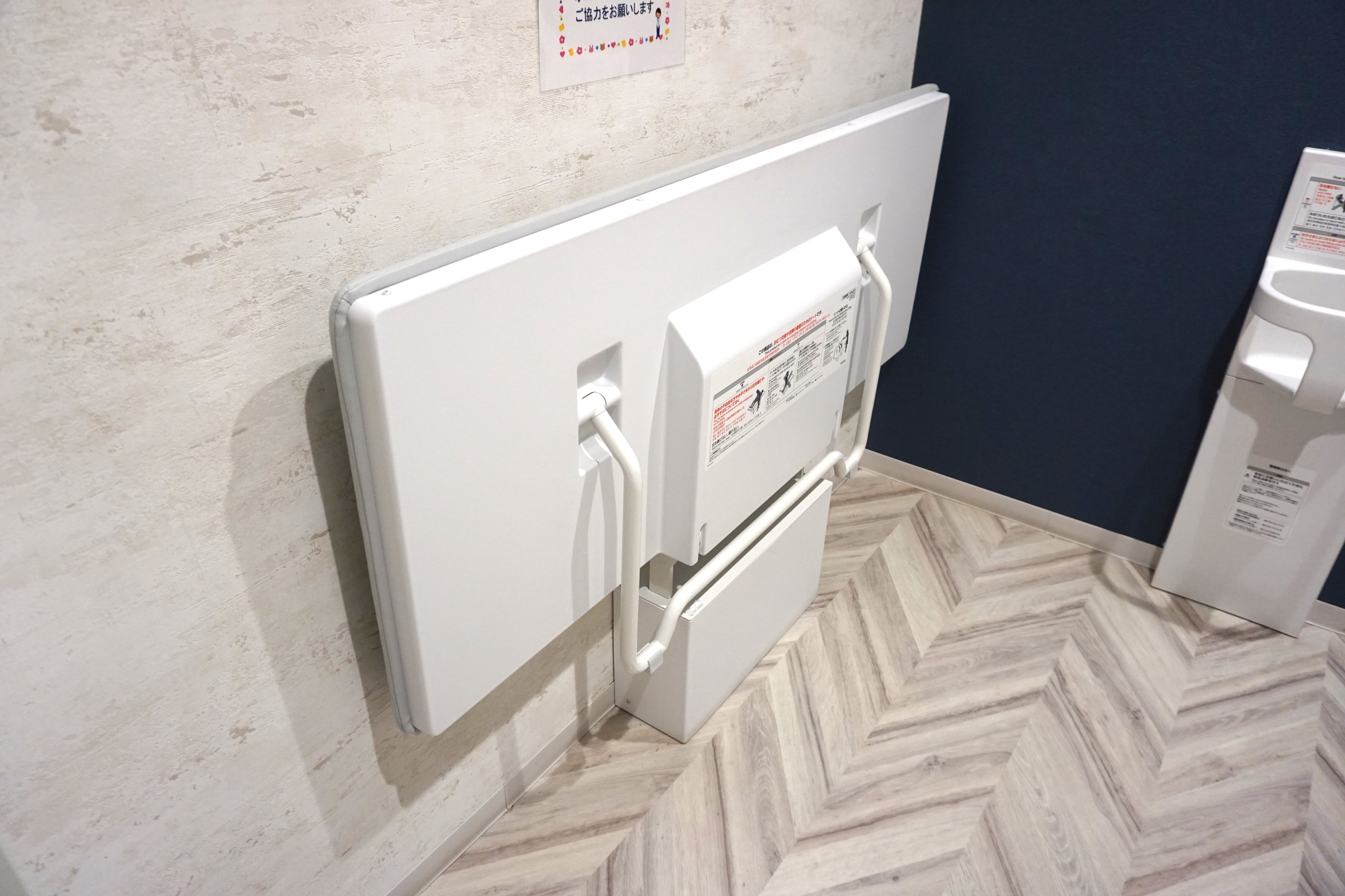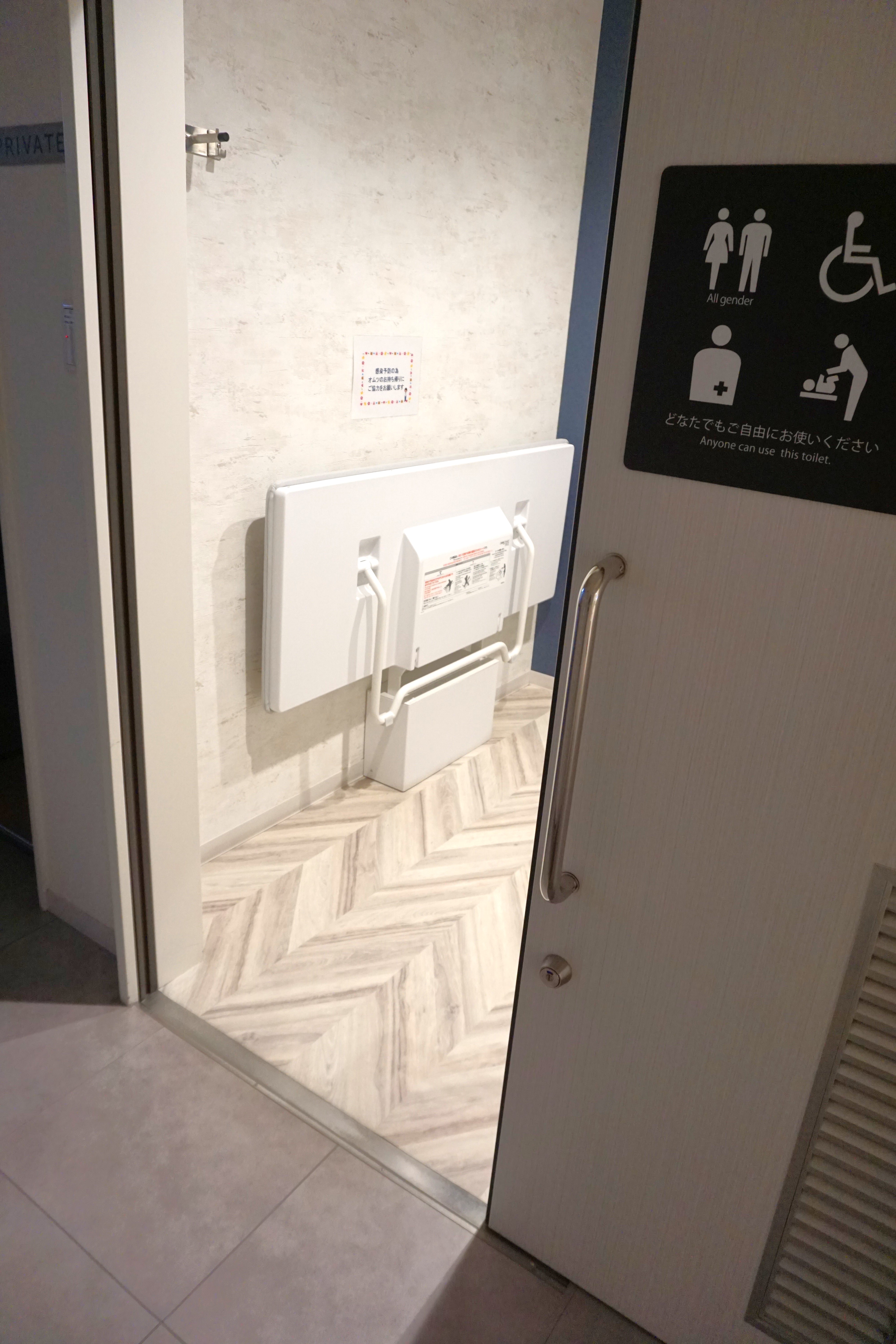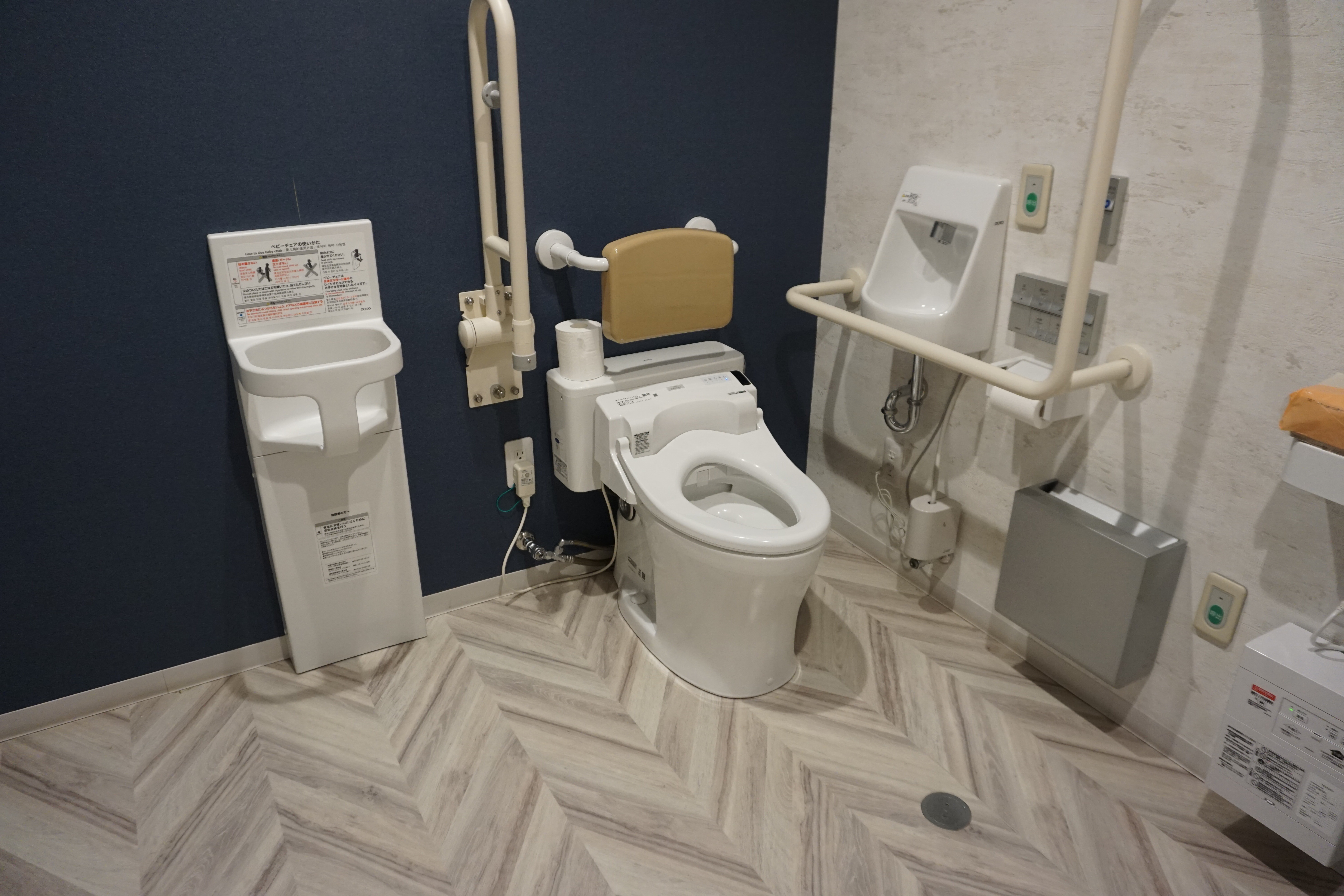 店内にバリアフリートイレあり、車いす対応トイレ・折り畳み式ユニバーサルシート・ベビーキープ・オスメイトがあります。