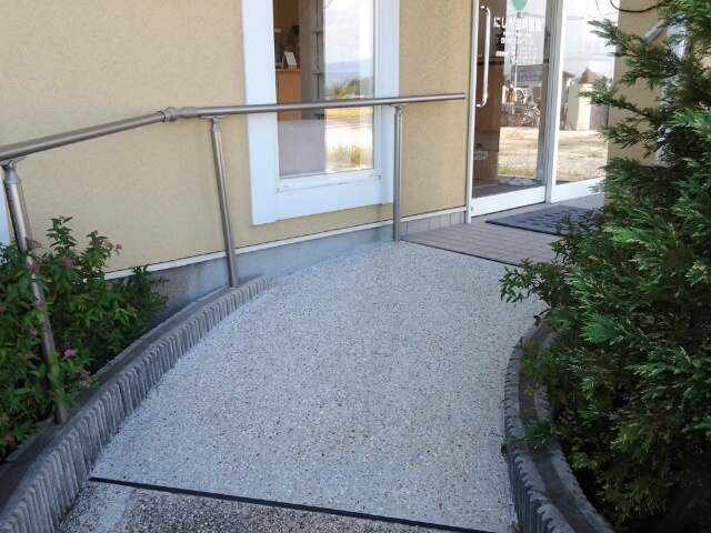 駐車場から出入り口まで3段の階段がありますが、横にスロープがあります。