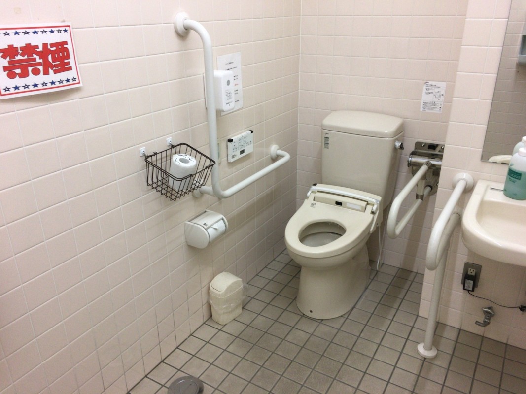 バリアフリートイレ内に、車いす対応トイレ、おむつ交換台、ベビーキープあります。
