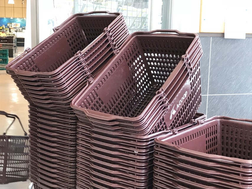 お店の入り口にある買い物カゴ置き場、、皆さんは何気なくカゴを取っているかと思いますが、カゴが斜めに重ねてあるととてもうれしいです。車いすユーザーは手の届く位置が低いので、カゴを上に持ち上げるという動作が大変です。なので横に引き抜けるよう斜めにカゴを置いてあるのはすごく助かります。