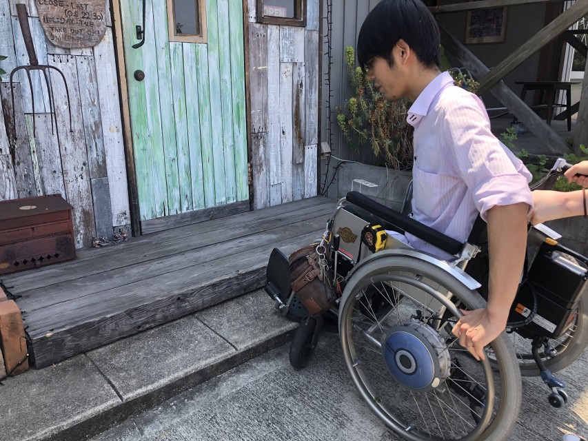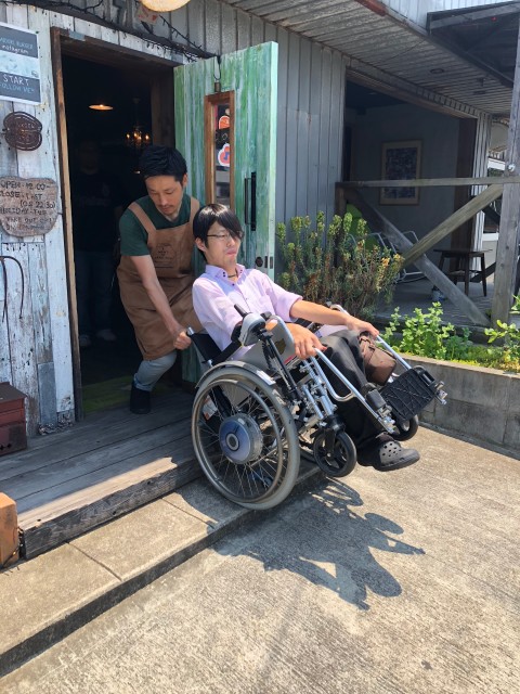 うわっ、まぶしいっ!電動車いすの転倒防止を格納し、言われるがまま、入り口にお背を向けます。すると、前輪が持ち上がったと思った瞬間、すいすいっとふたつの段差を超えていくではないですか!こんなの初めて♡