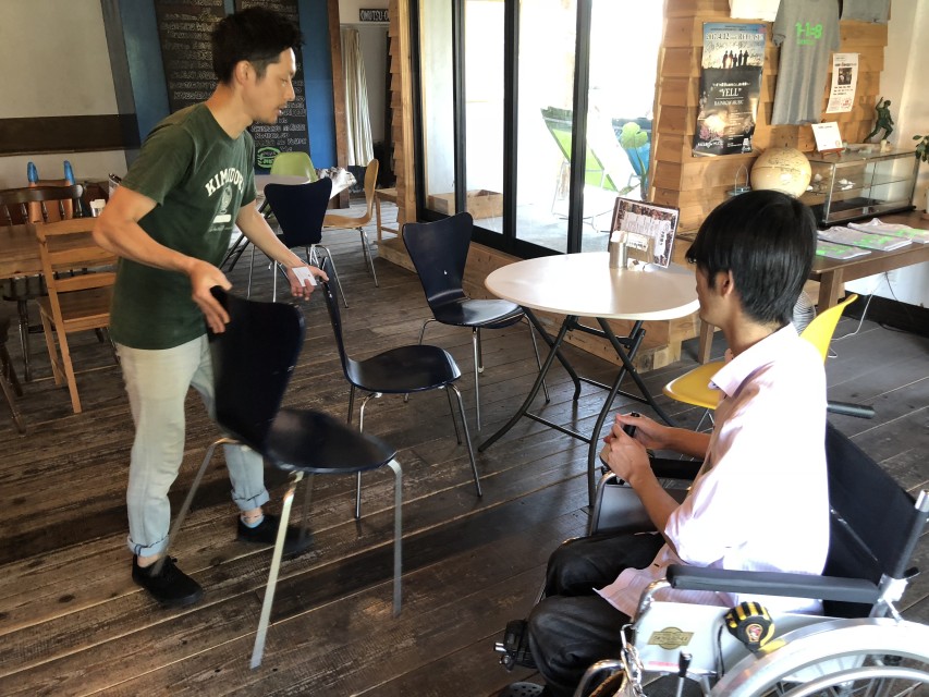 店内はテーブルが3種類ほどあり、自分にあった席をチョイスできました。丸テーブルもありましたが、フットレストとテーブルの脚がケンカしちゃいそうだったので、四角のテーブルを選びました。適度な高さがあり、私の車いすにジャストフィットです。思わず一瞬家庭を忘れて他のリポーターとの会話も弾みます!
