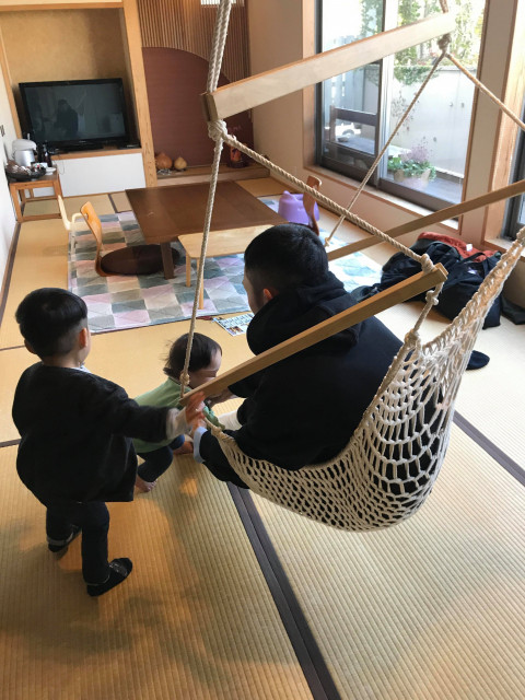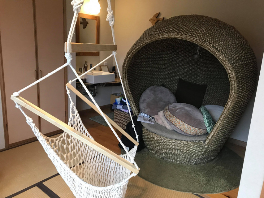 12畳の畳の部屋には、ハンモックと女将さんが選んだ家具に飾り。きのこやつばめがお部屋の色んなところに飾られていて、探すのも楽しい♪どれも素敵ですぐにお部屋が気に入った私たち。長男は早速ハンモックに乗ってご満悦。この部屋は子ども連れがお部屋でも遊べるようにと工夫がたくさんありましたよ。