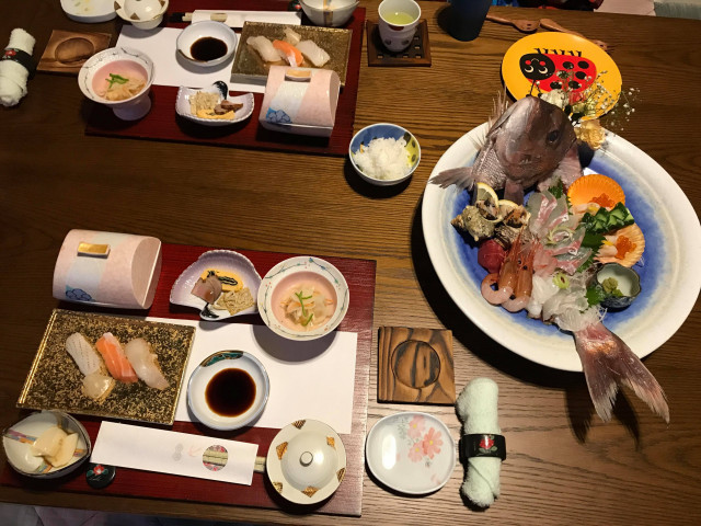 子どもたちにもお皿、スプーン、フォーク、椅子、バンボを用意して下さいました。夕食では立派な刺し盛りに夫婦でびっくり!順番に運ばれてくる料理は食器もかわいくって目でも楽しめ、そしてどれもこれもおいしくって大満足!