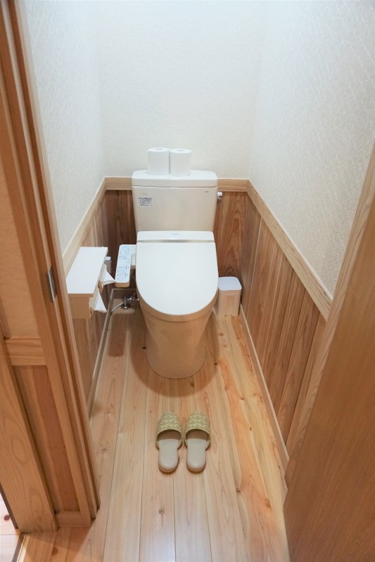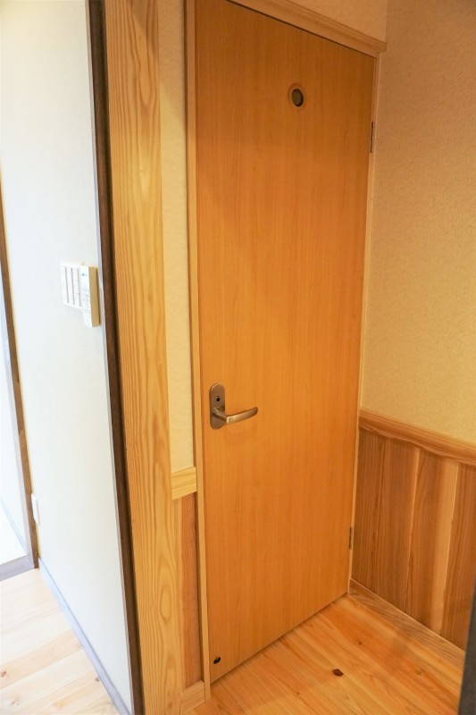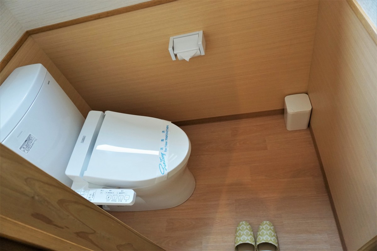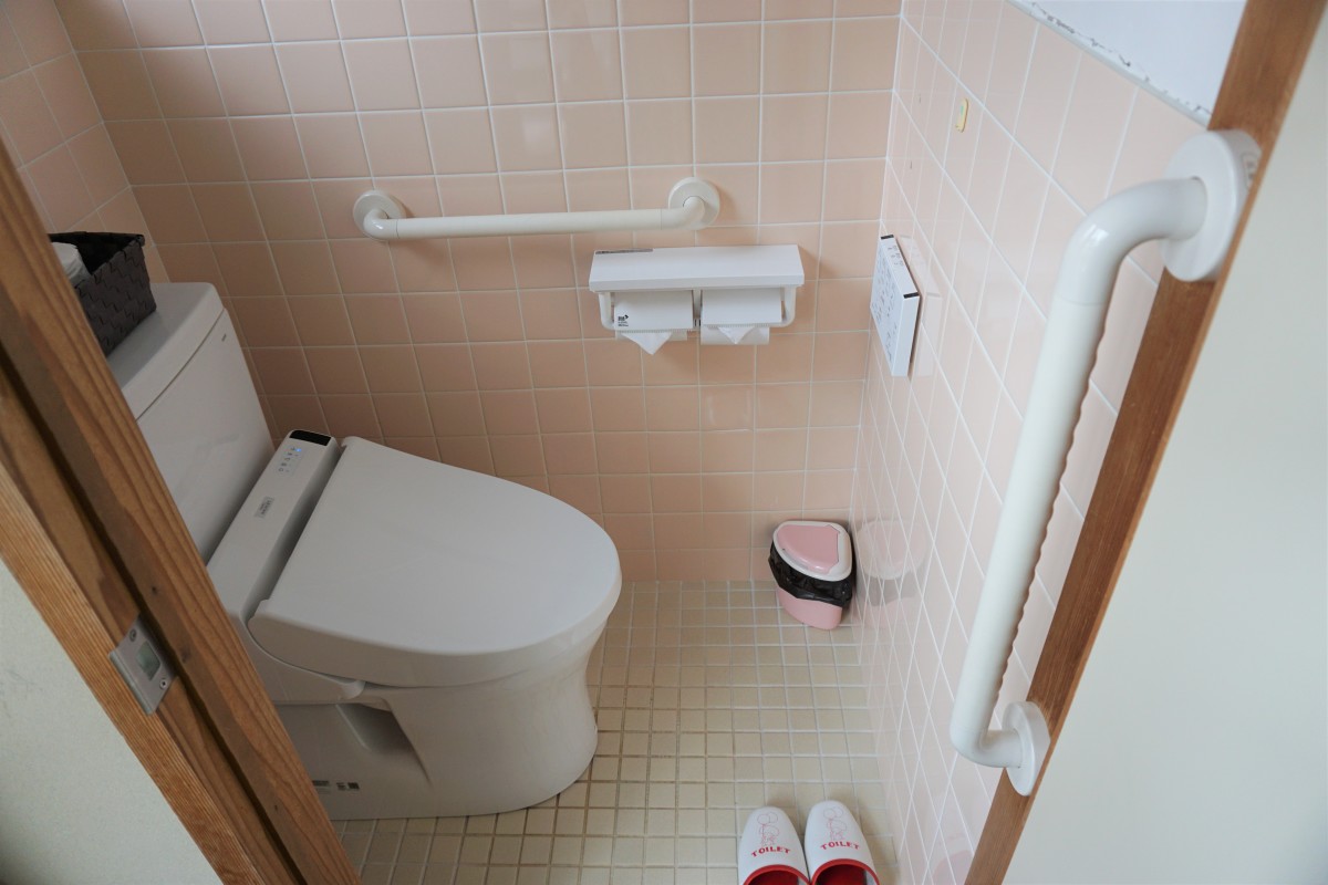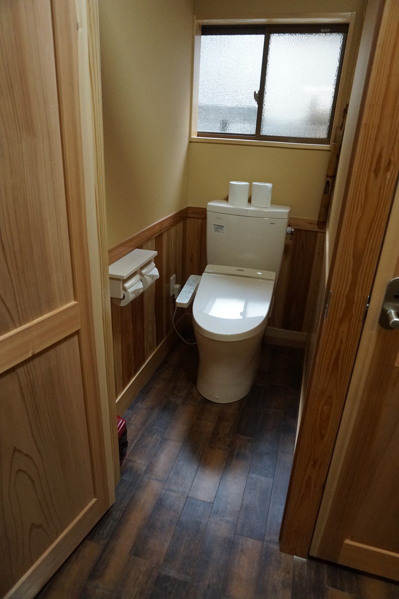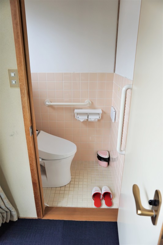 2階和室の客室内のトイレは1段下がる段差あり、手すりつきです。