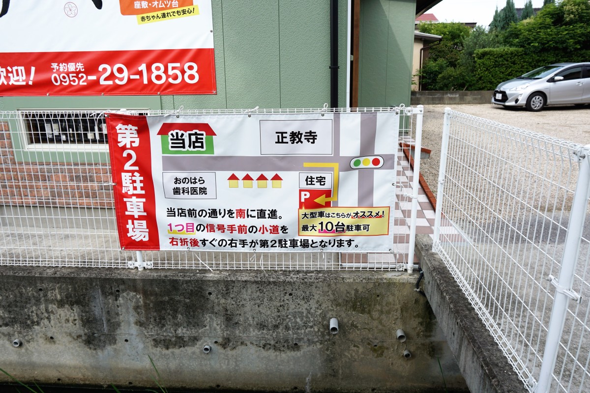 店の正面に5台、第二駐車場に10台駐車可能。