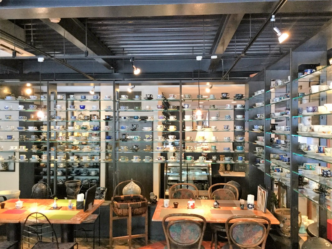 店内の壁面には、有田・波佐見・伊万里・嬉野を中心に肥前窯業圏のコーヒーカップを2500客以上コレクションしており、高価なものから今では製造されていない珍しいものもあります。